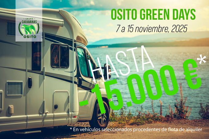 Del 7 al 15 de noviembre vuelven los Green Days de Caravanas Osito: • Liquidación en ocasión y vehículos de flota de alquiler con hasta 15.000€ de descuento*. * Ofertas válidas en vehículos seleccionados de ocasión y de flota de alquiler. Los precios mostrados en la web incluyen el descuento. Horario de apertura habitual,