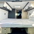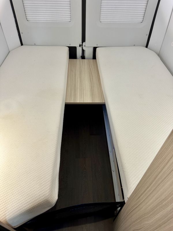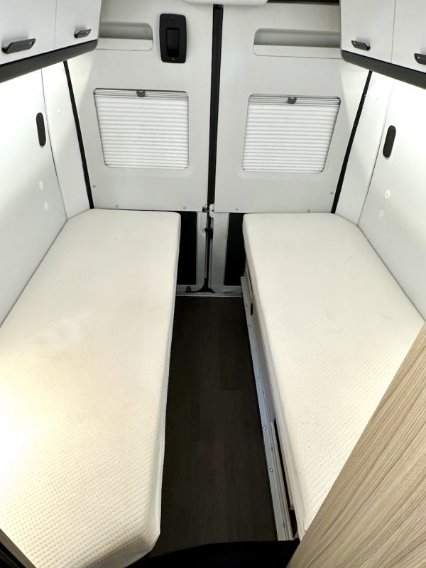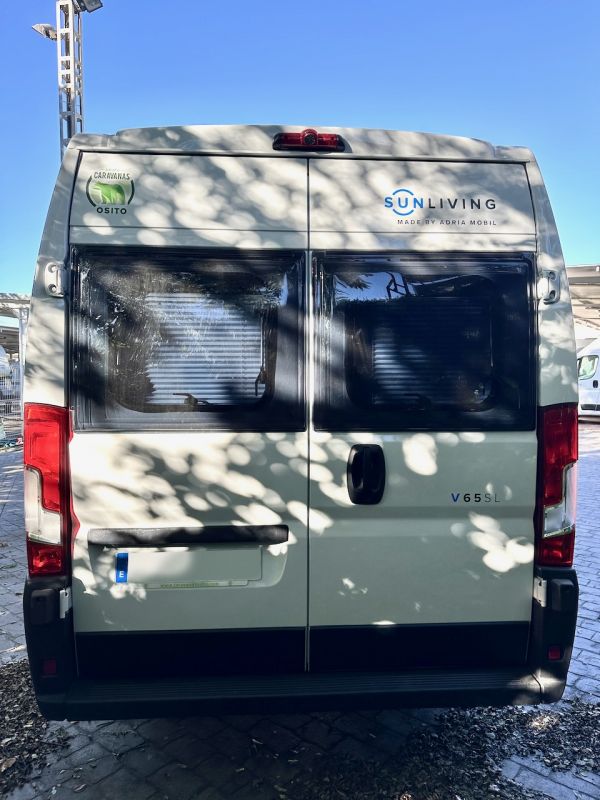 Autocaravana tipo camper Sun Living V65 SL procedente de flota de alquiler, con distribución de camas gemelas en la parte trasera, comedor con asientos de cabina giratorios, cocina completa con nevera de 84 litros y baño con ducha.