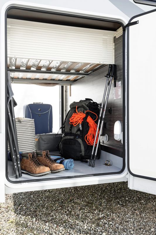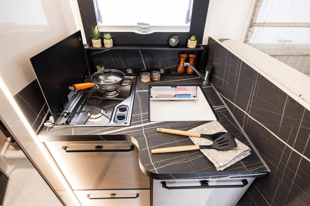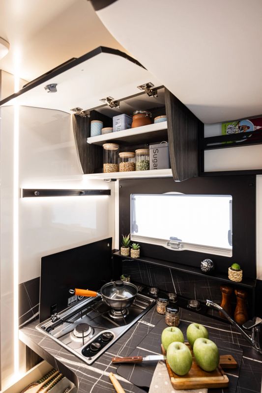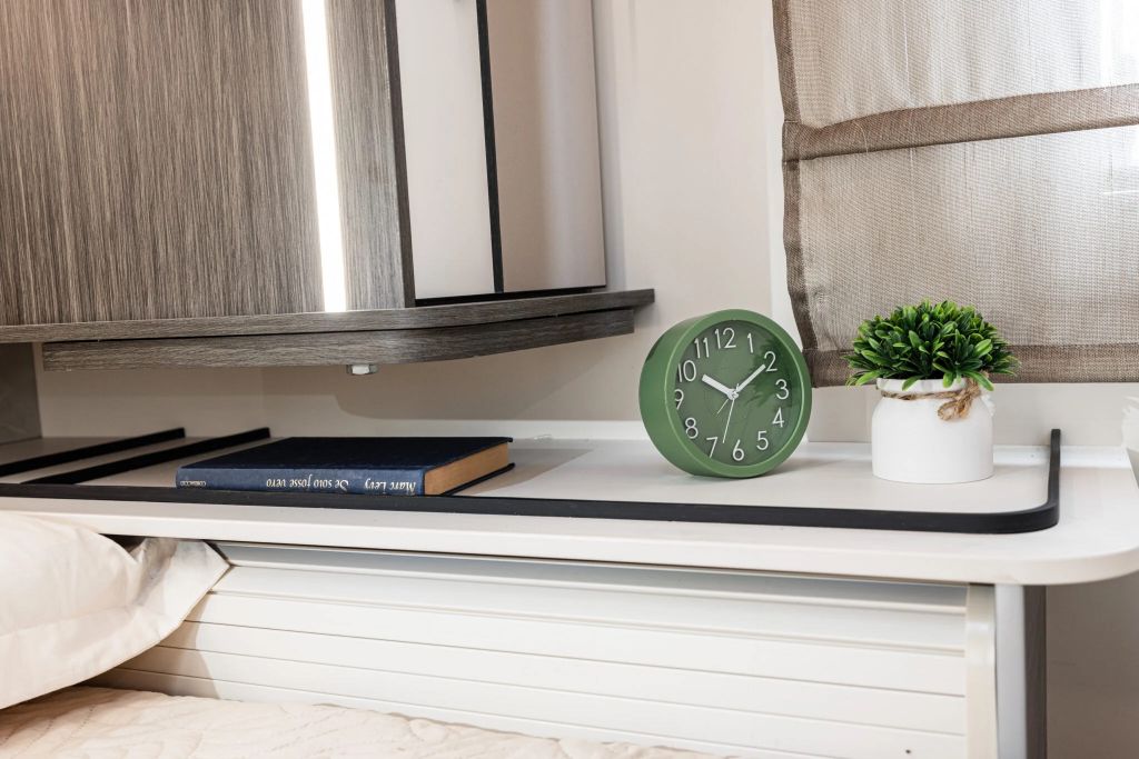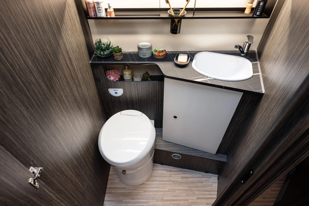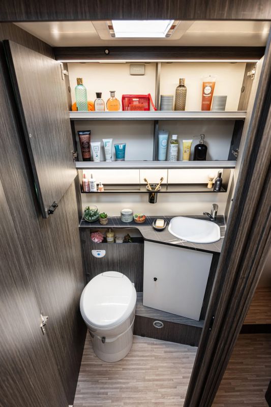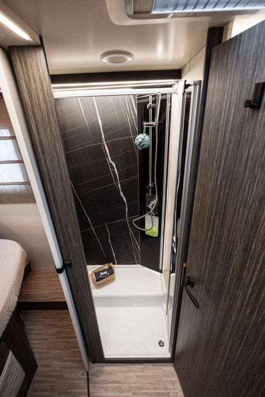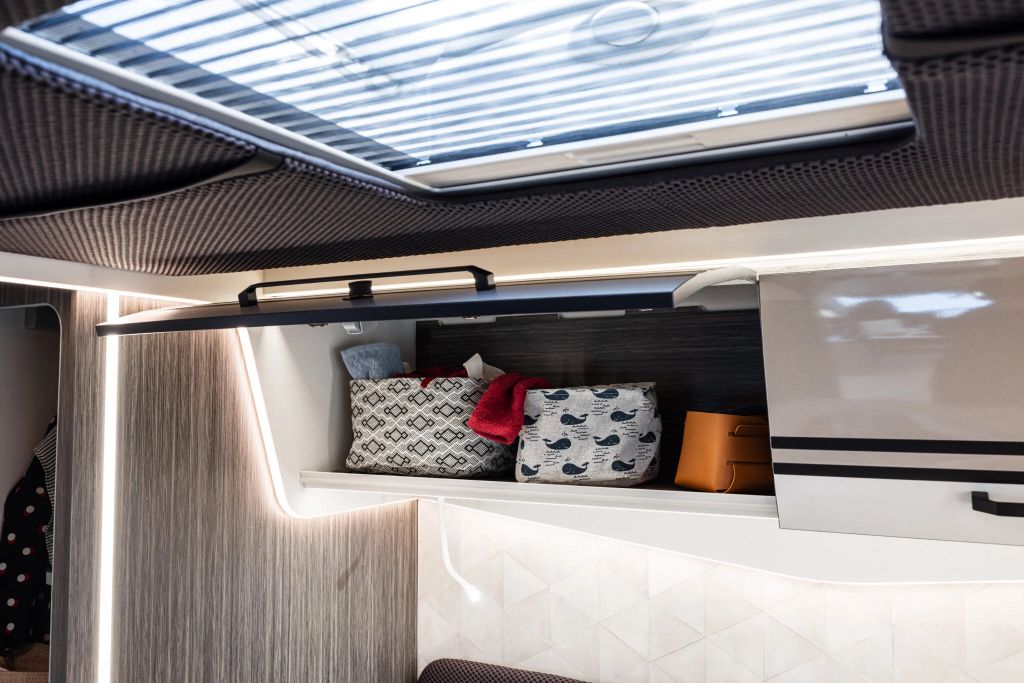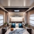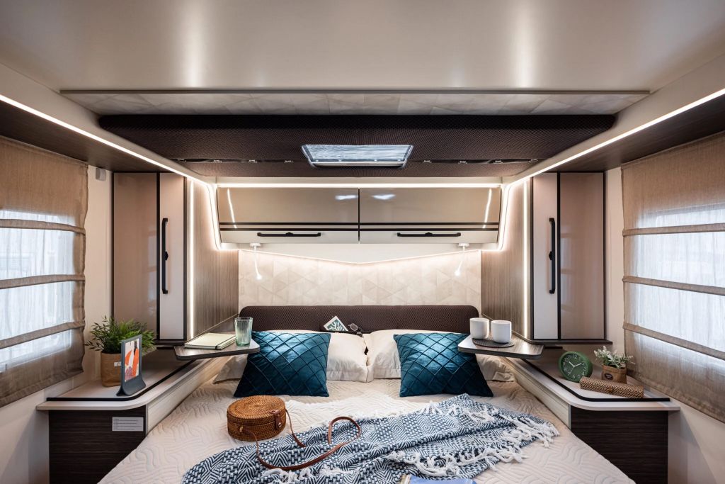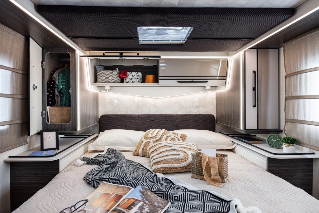 Autocaravana integral McLouis Nevis 879 de la temporada 2026, con distribución de cama isla en el dormitorio, cama basculante sobre cabina, comedor en rotonda con los asientos de cabina girados, cocina completa con nevera de 158 litros, baño y ducha independiente.