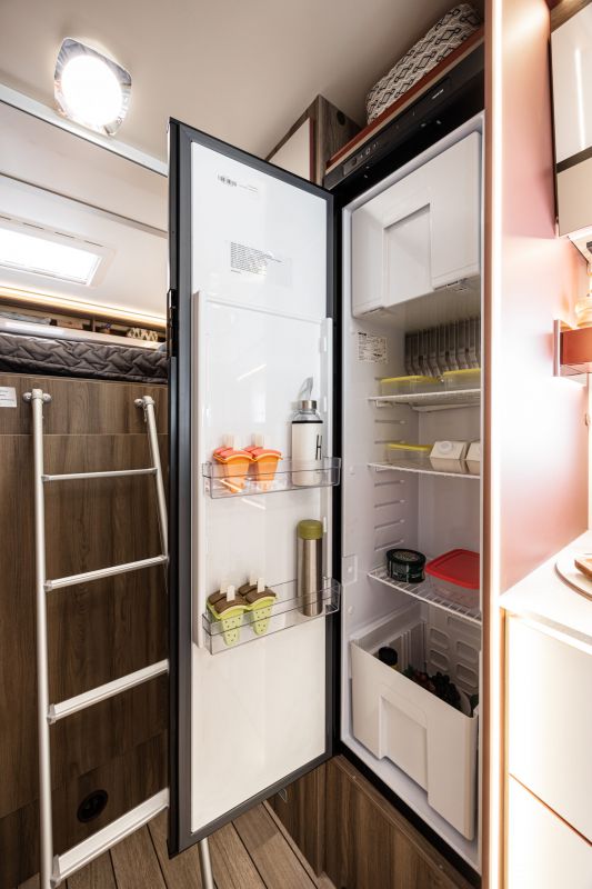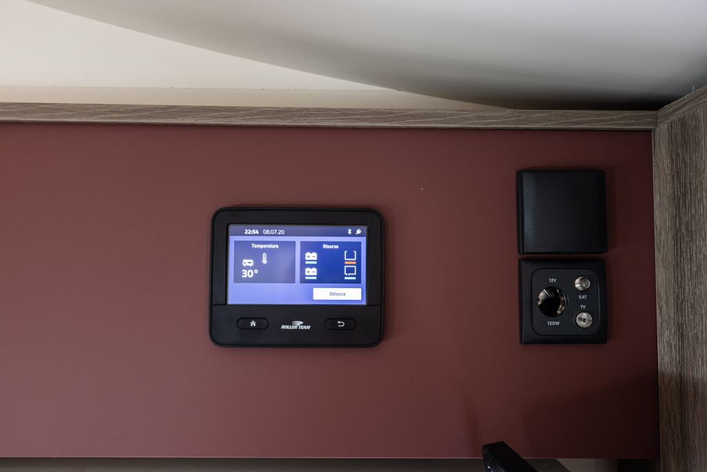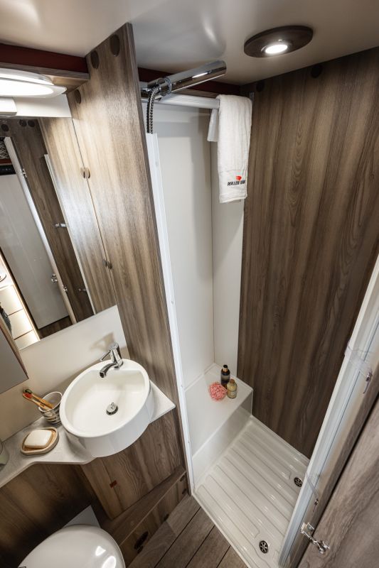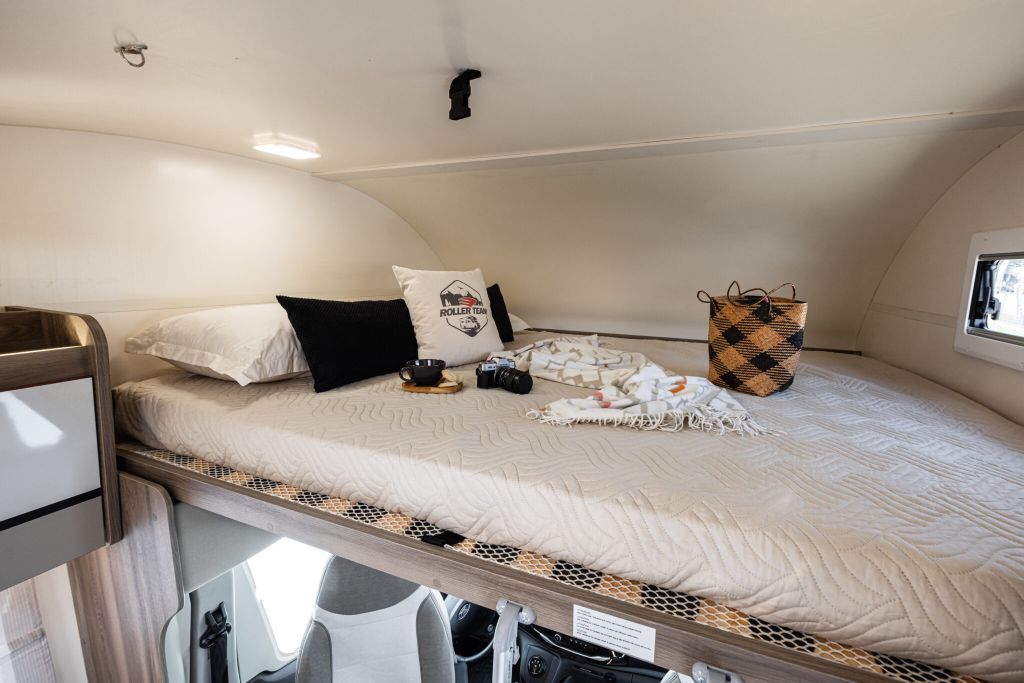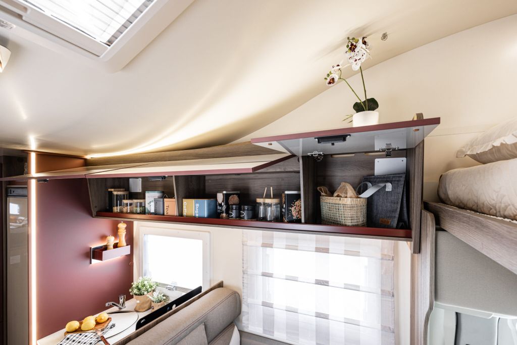 Autocaravana capuchina Roller Team Kronos 290 M, de la temporada 2026, con distribución con la cama encima del garaje, cama doble en la capuchina, comedor en L, cocina completa con nevera de 137 litros, baño con ducha y garaje XXL de gran capacidad,.