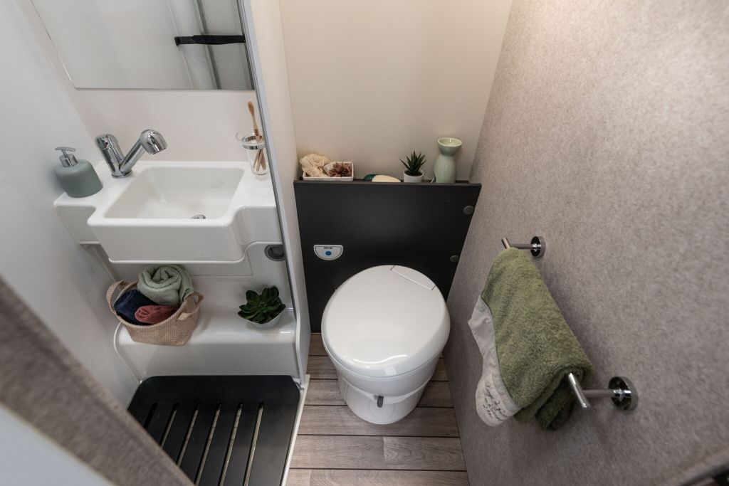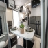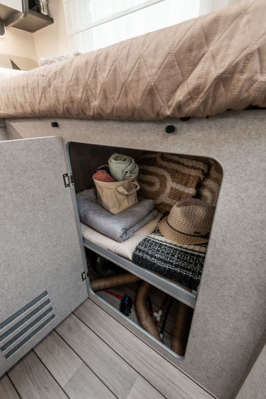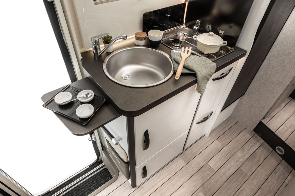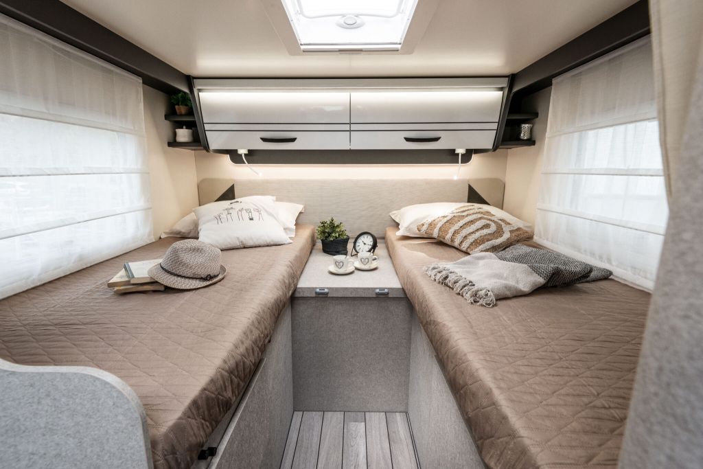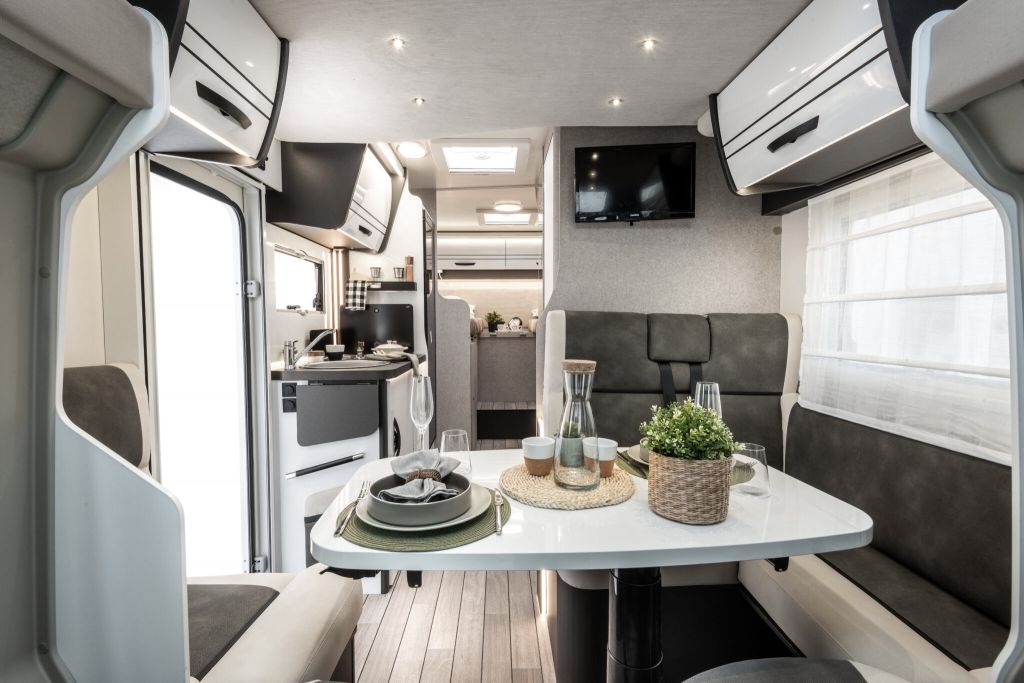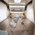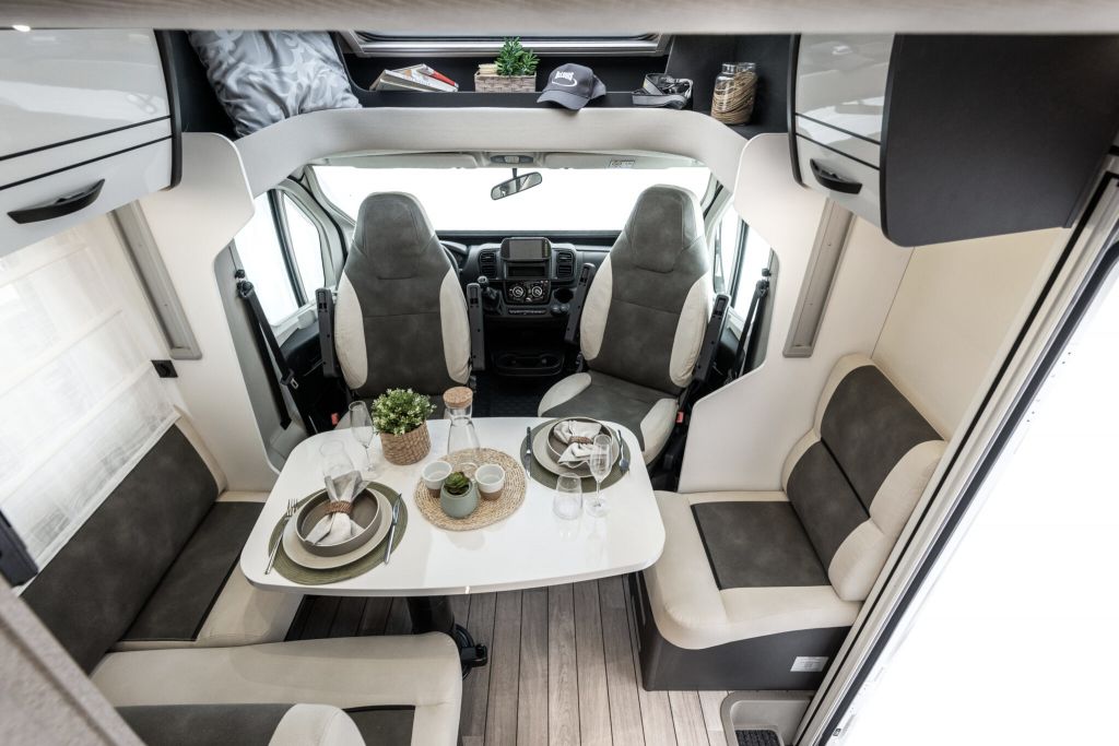 Autocaravana perfilada McLouis Mc4 365 de la temporada 2026, con distribución de cama gemela sobre garaje, cama suspendida sobre el comedor, comedor en rotonda con los asientos de cabina girados, cocina completa, baño y ducha independiente.