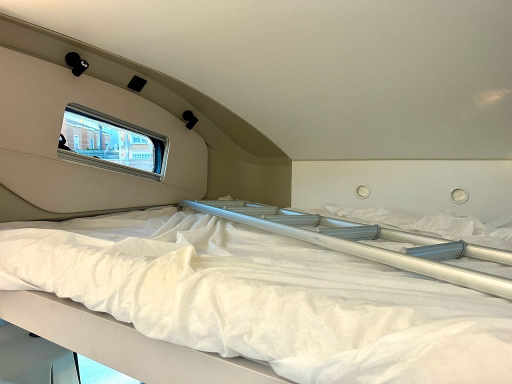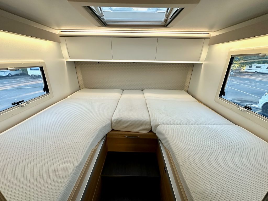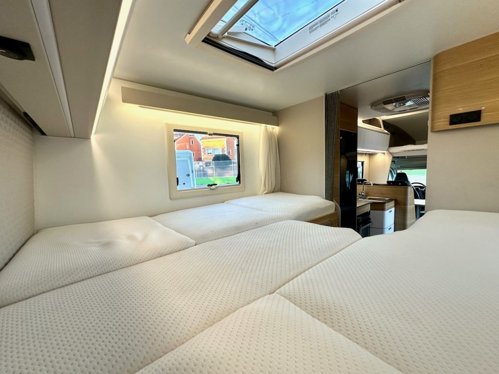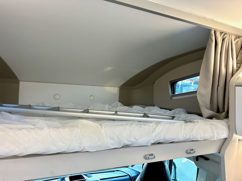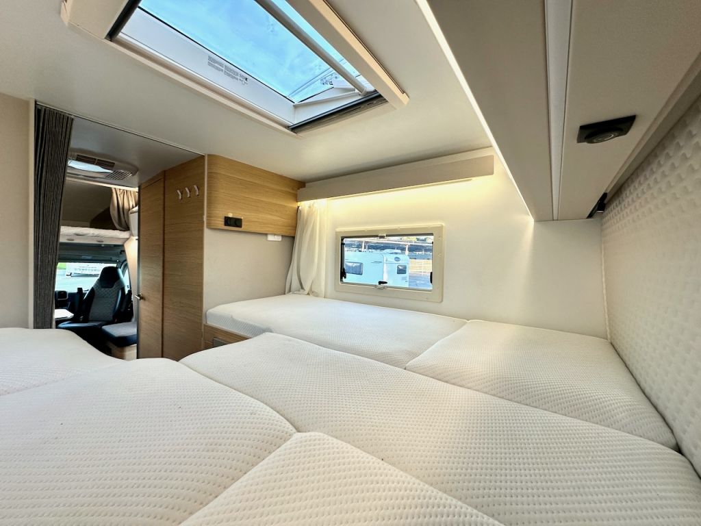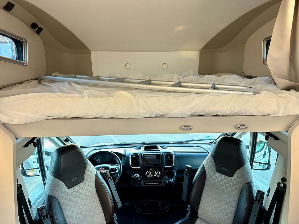 Autocaravana capuchina Adria Coral XL Axess 660 SL del año 2024. Distribución de camas gemelas y cama de matrimonio en la capuchina. Comedor clásico en L con asientos de cabina giratorios. Cocina completa con nevera de 130 litros. Baño con ducha.