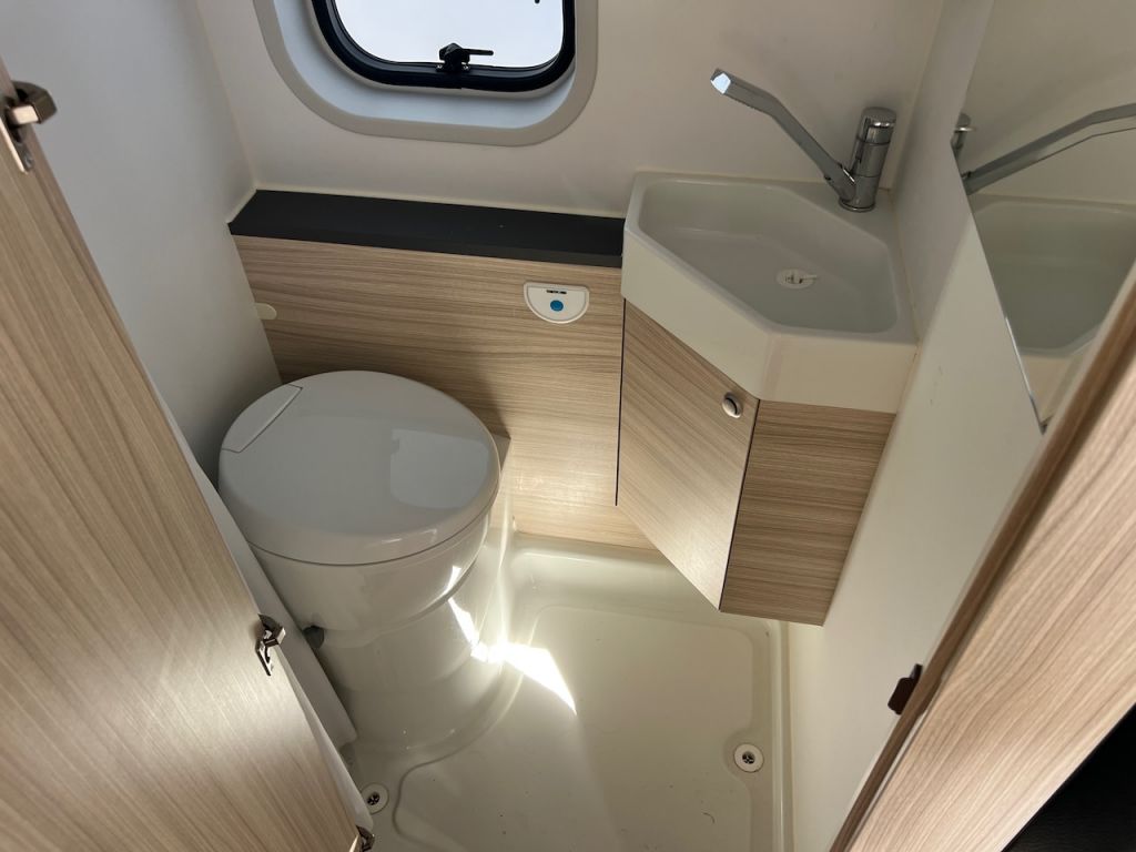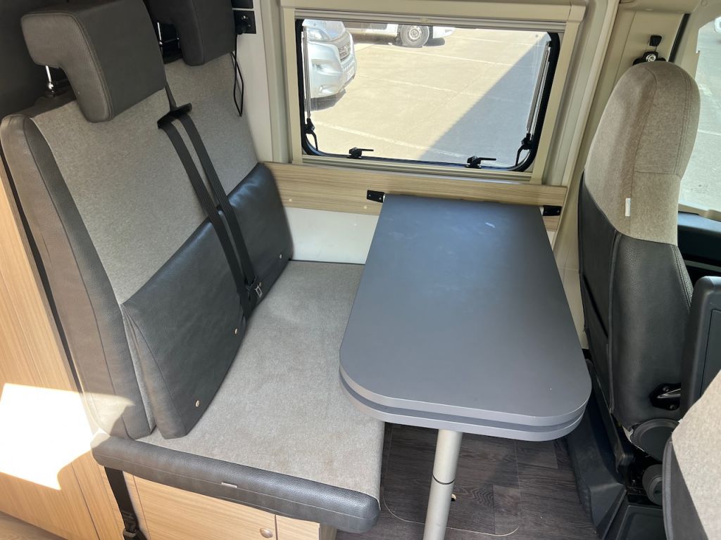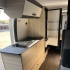 Autocaravana camper Sun Living V60 TentTop de ocasión con distribución de cama transversal sobre garaje, comedor con asientos de cabina giratorios, cocina completa de 138 litros y baño con ducha.