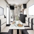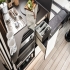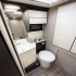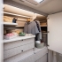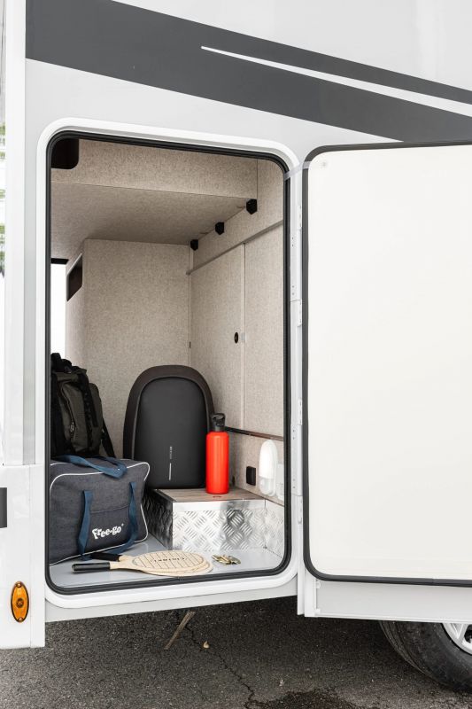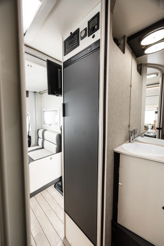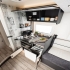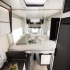 Autocaravana perfilada tipo slim (de ancho reducido) con distribución de cama suspendida de 190 x 142 cm sobre el comedor, comedor enfrentado con mesa tipo libro convertible en cama de 201 x 104/97 cm, cocina completa con nevera de 137 litros y vestidor con un gran armario en la parte trasera con baño y ducha independientes.