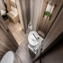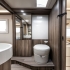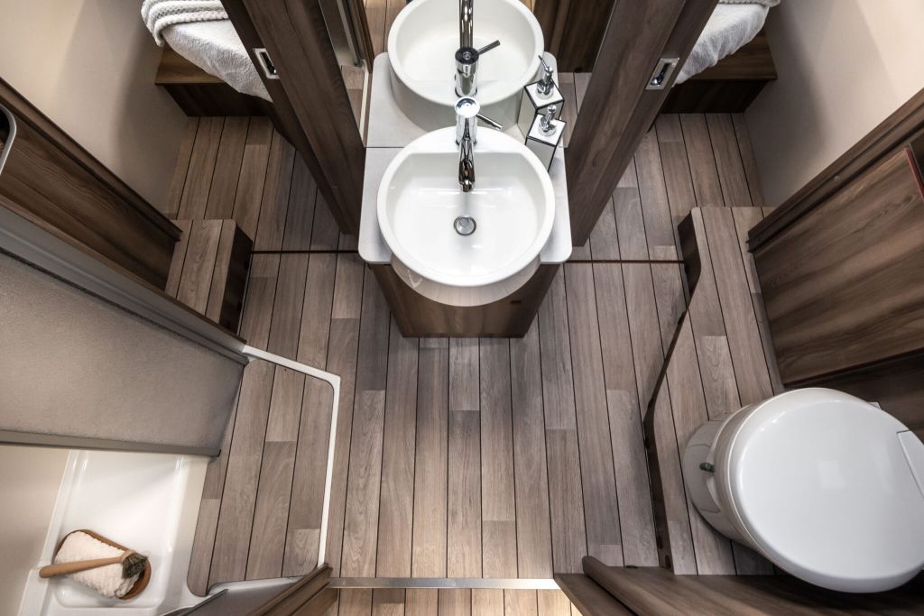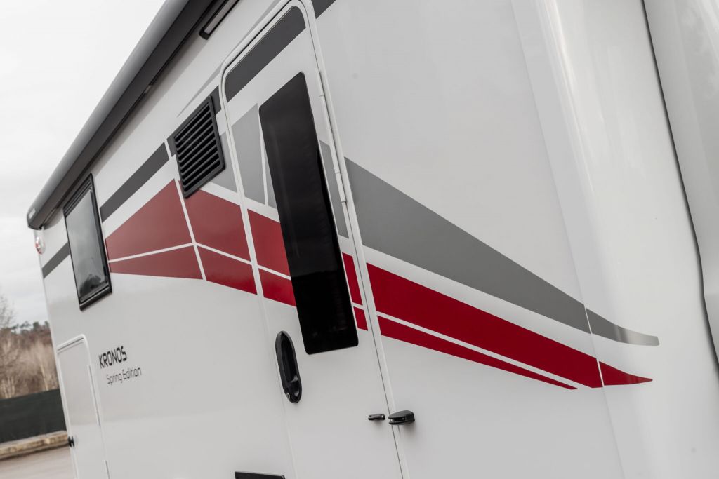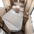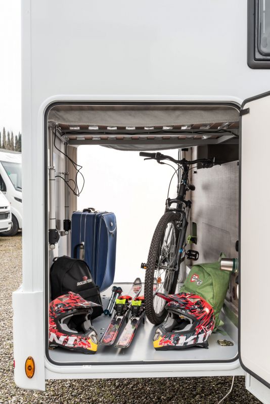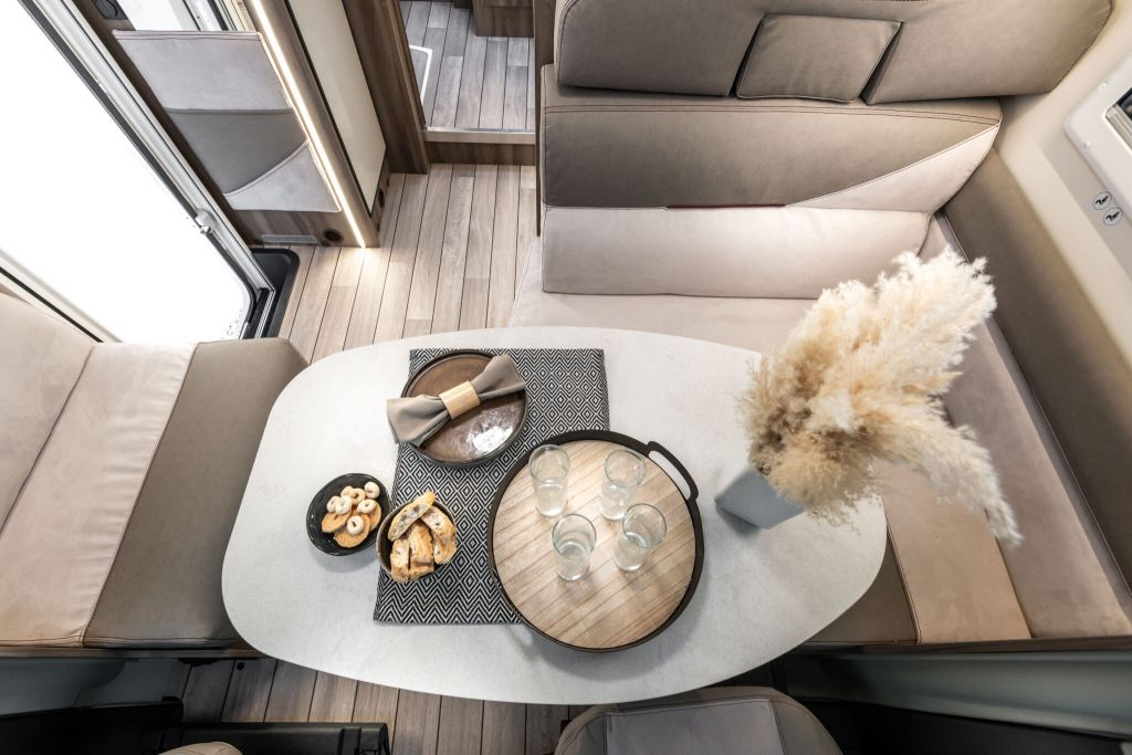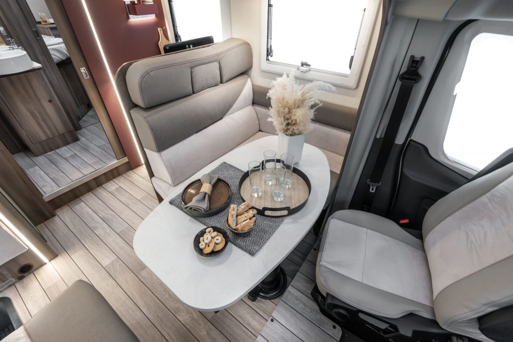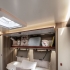 Autocaravana perfilada Roller Team Kronos 266 TL con distribución de cama isla, cama suspendida sobre el comedor, comedor en L con asientos de cabina giratorios, cocina completa con nevera de 137 litros, lavabo situado en el centro del vehículo a los pies de la cama, ducha y WC independientes.
