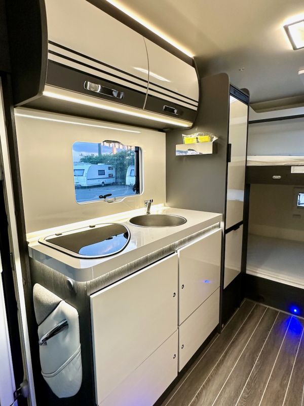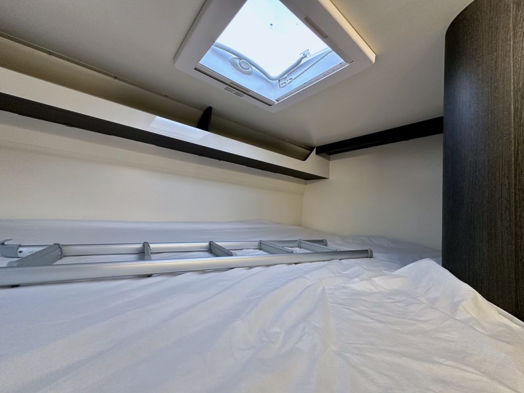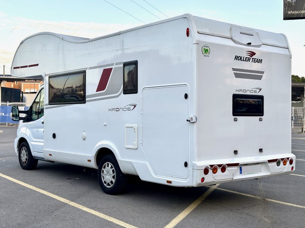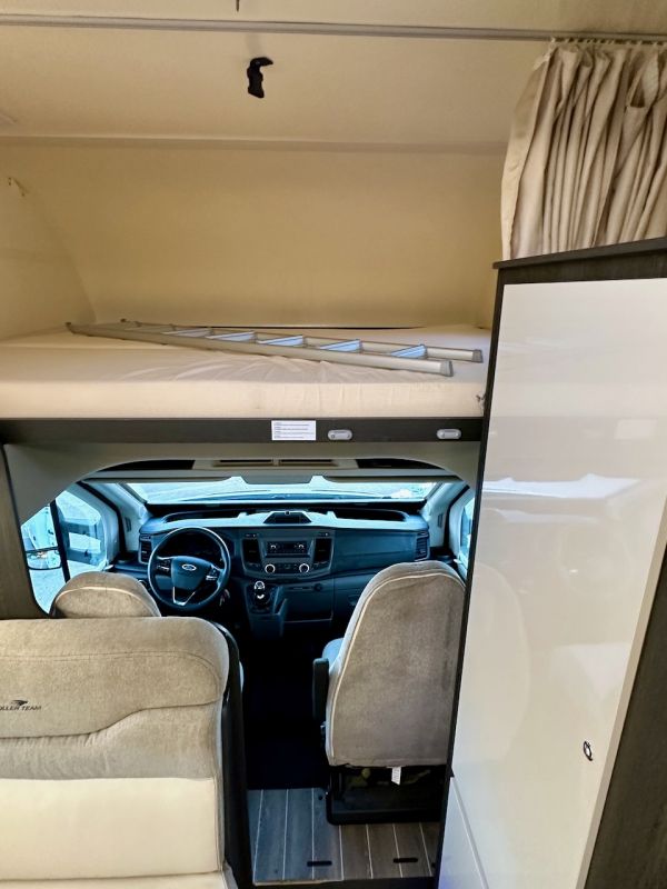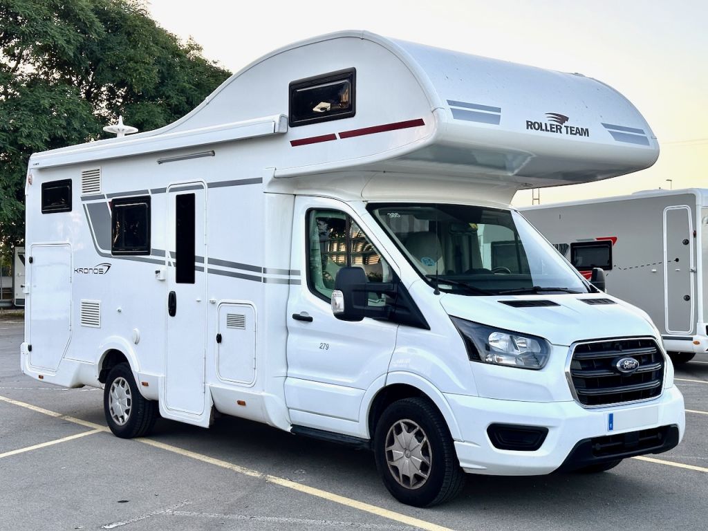 Autocaravana Capuchina Roller Team Kronos 279 M, con distribución de literas, cama de matrimonio en la capuchina, comedor enfrentado, nevera grande, baño, ducha y cocina completa.
