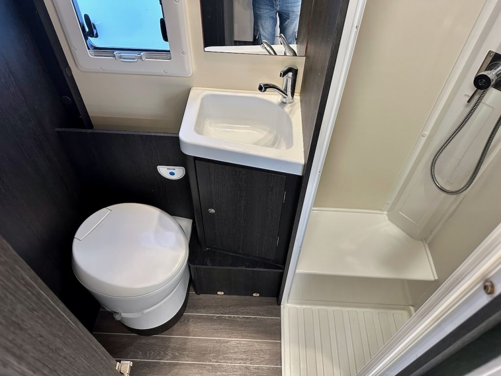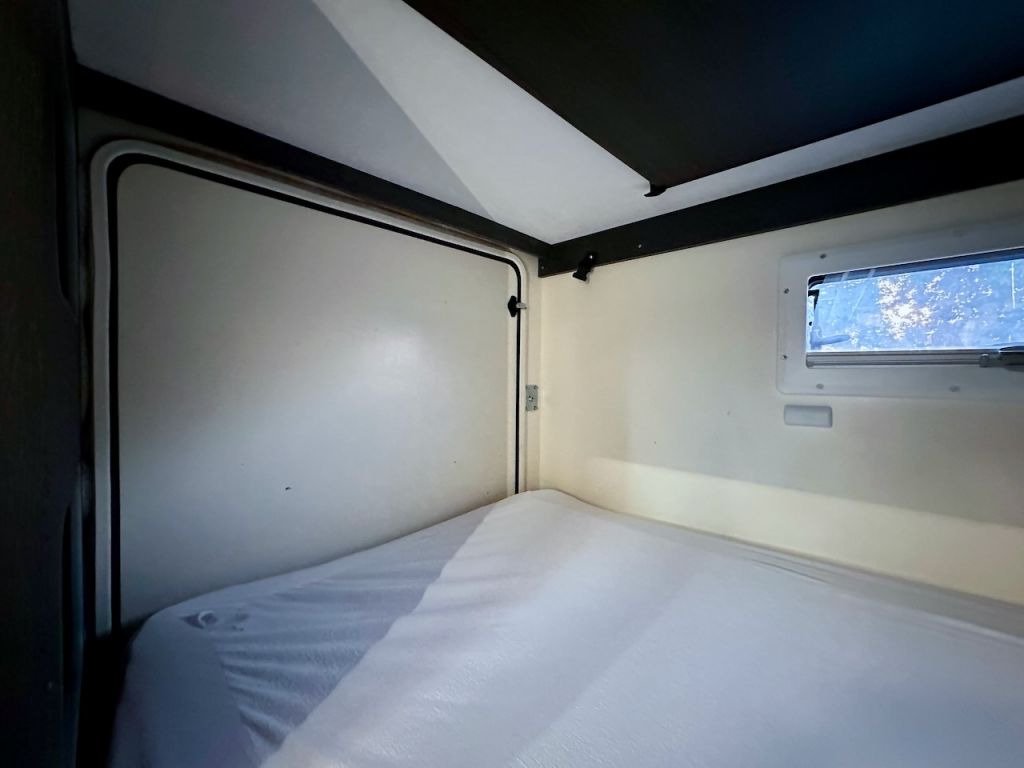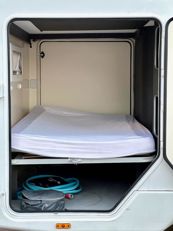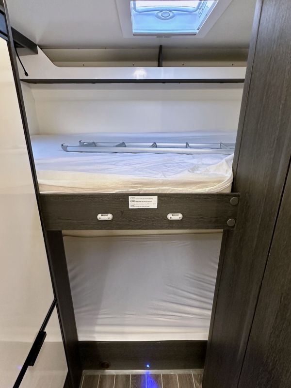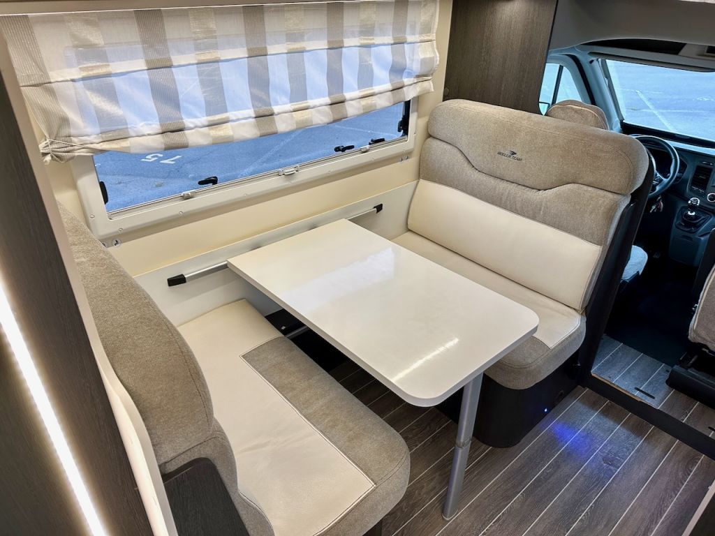 Autocaravana Capuchina Roller Team Kronos 279 M, con distribución de literas, cama de matrimonio en la capuchina, comedor enfrentado, nevera grande, baño, ducha y cocina completa.