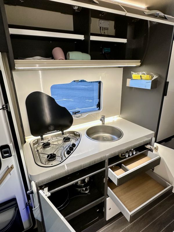 Toldo; Batería 120 Ah AGM; Placa solar; Inversor 600W onda pura; Retrocámara; Puerta con dos puntos de cierre y cierre centralizado; Isofix; Alarma volumétrica; Alarma de gases; Cierres de seguridad; Oscurecedores cabina;