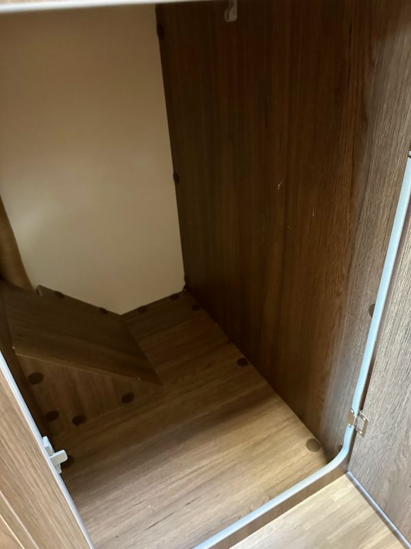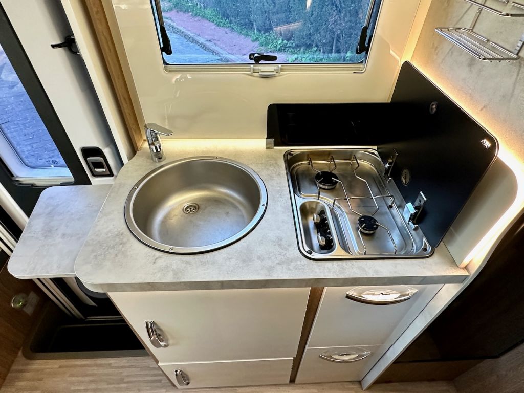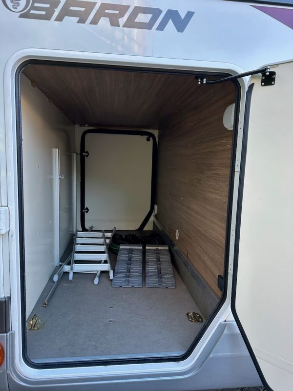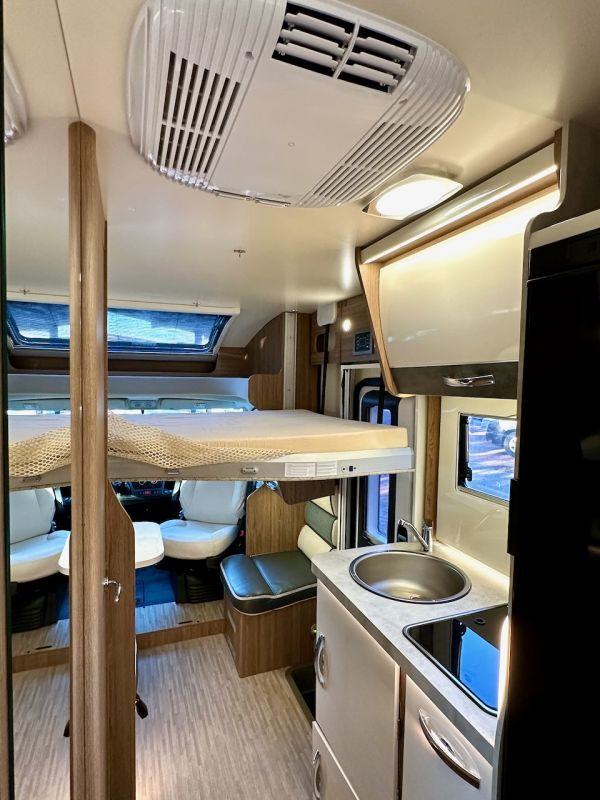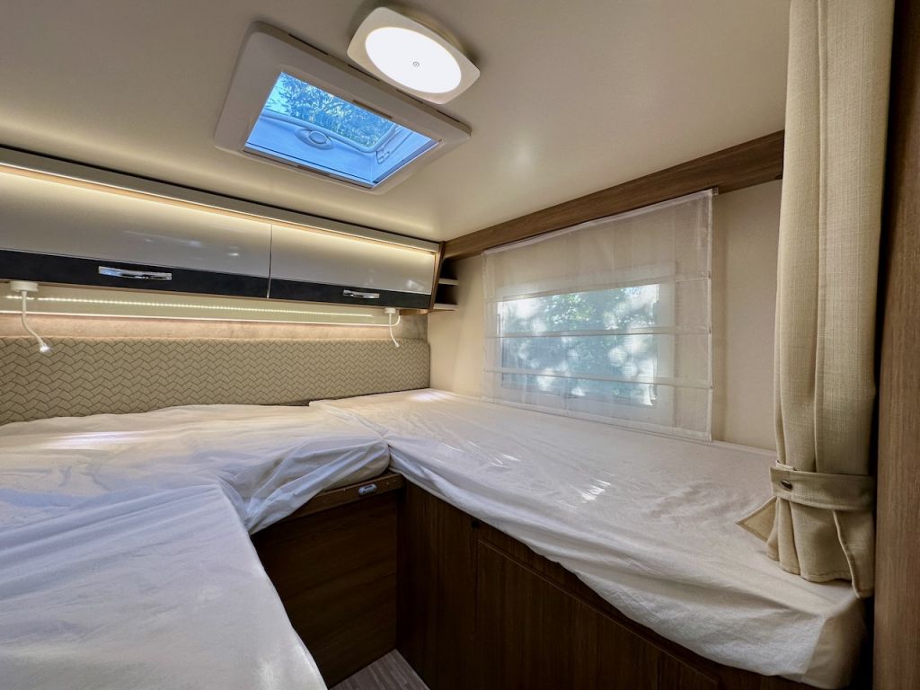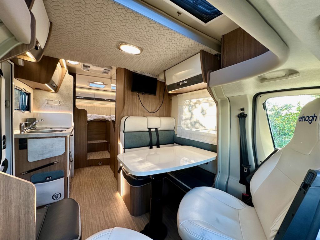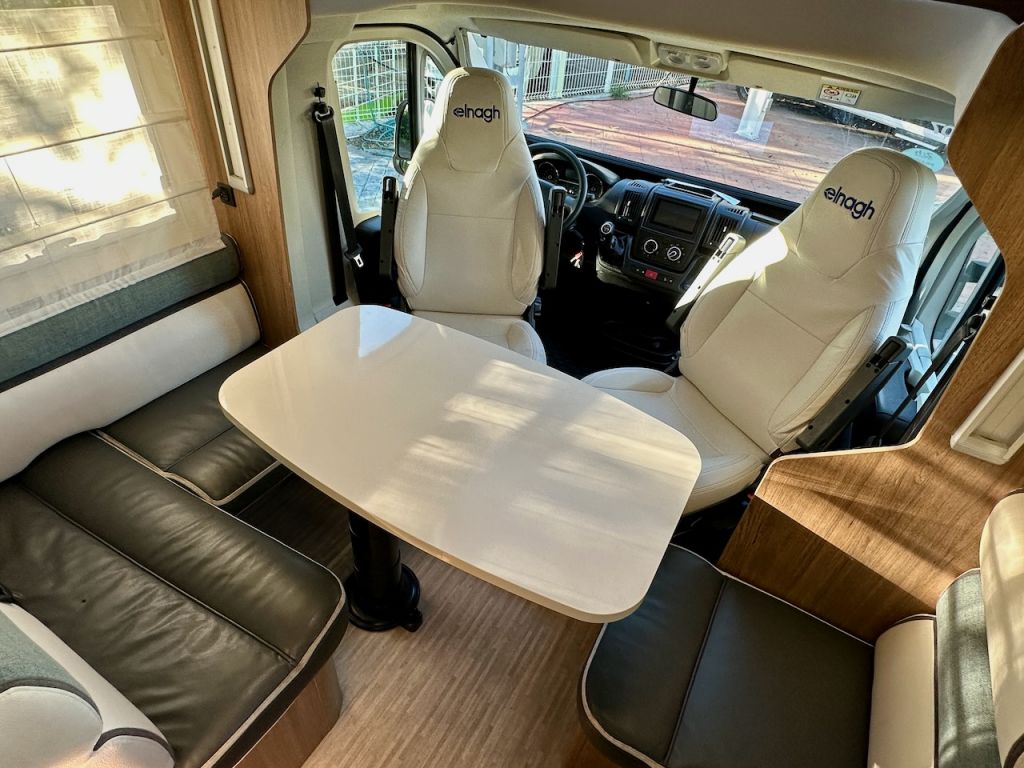 Autocaravana perfilada de ocasión Elnagh Baron 565 con distribución de camas gemelas, cama doble suspendida sobre el comedor, comedor con asientos de cabina giratorios, cocina completa con nevera de 130 litros y baño con ducha.