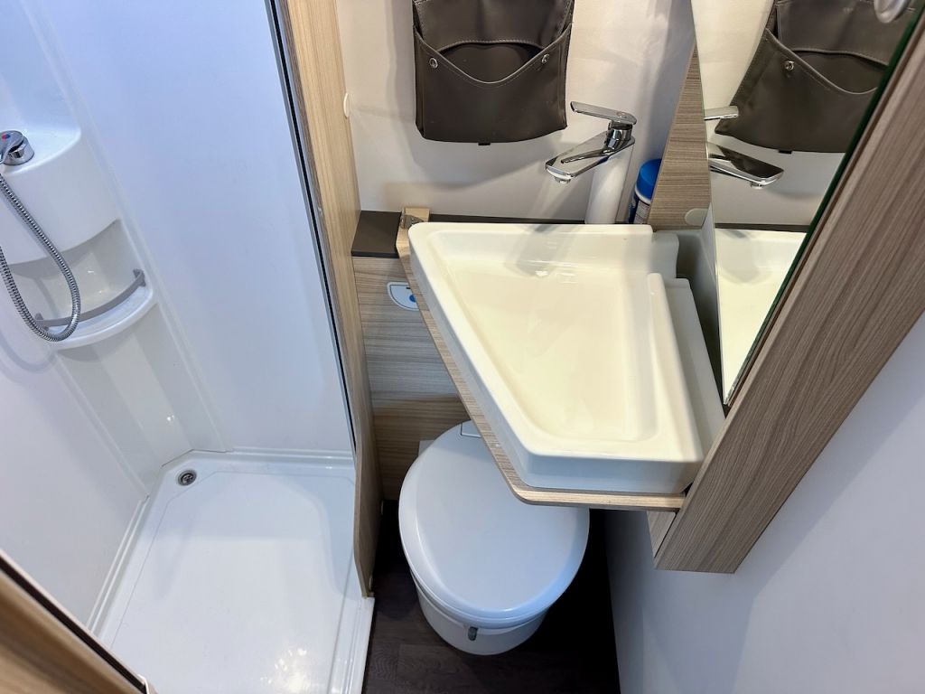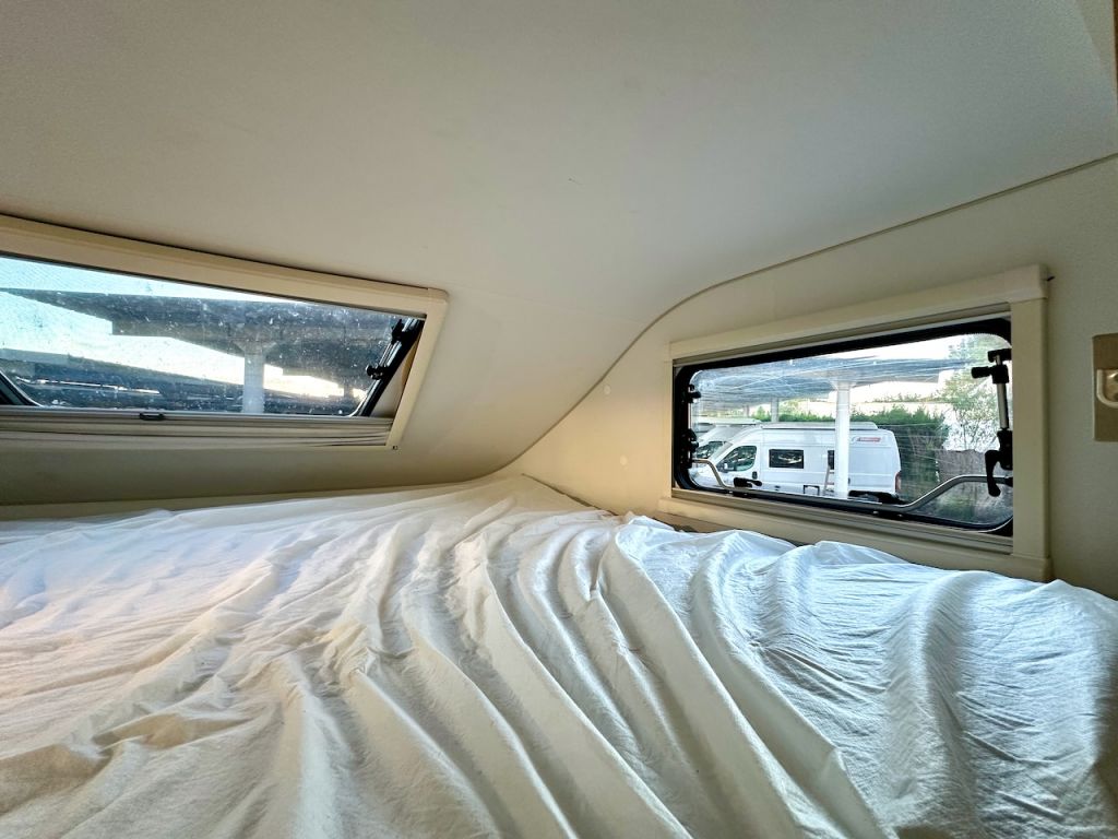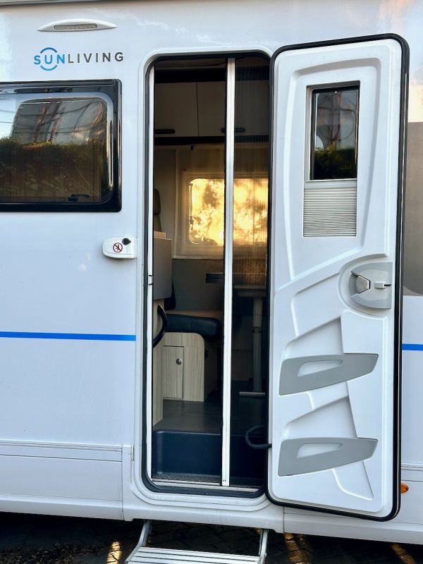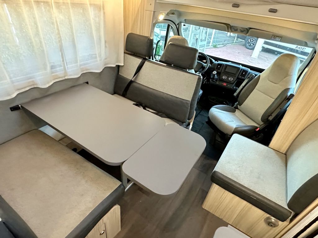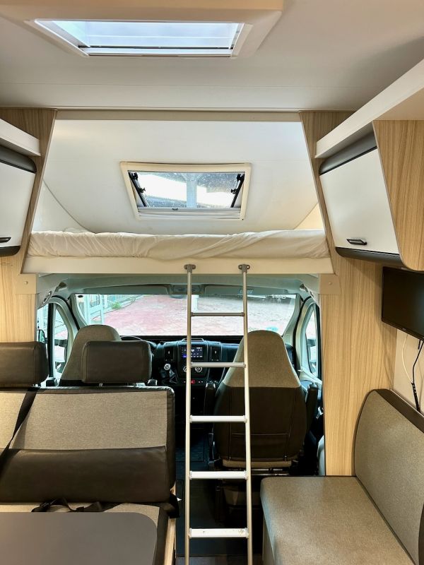 Autocaravana capuchina de ocasión Sun Living A75 DP con distribución de cama transversal de dos plazas en la parte trasera, cama de dos plazas en la capuchina, comedor enfrentado, cocina completa con nevera de 130 litros y baño con ducha.