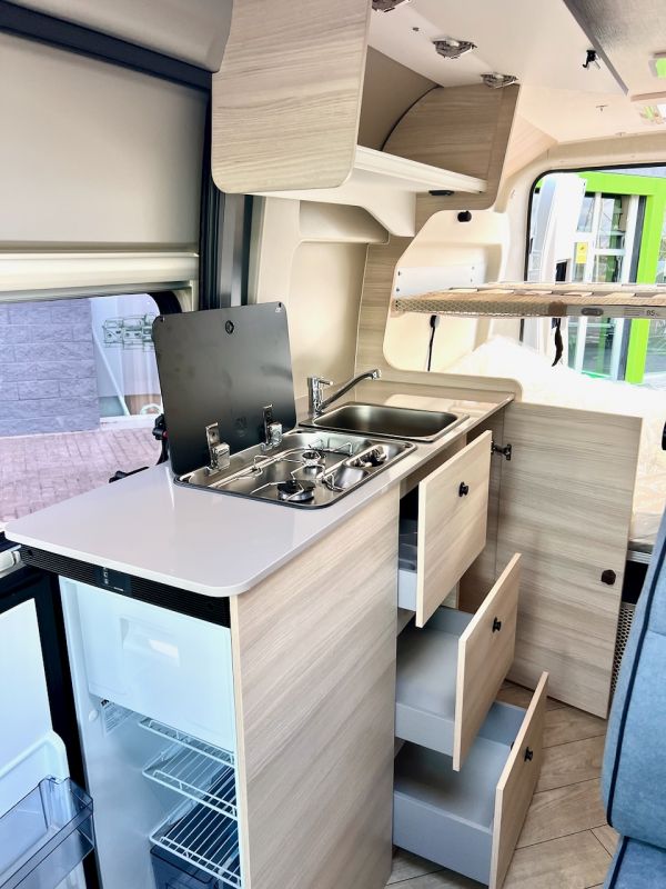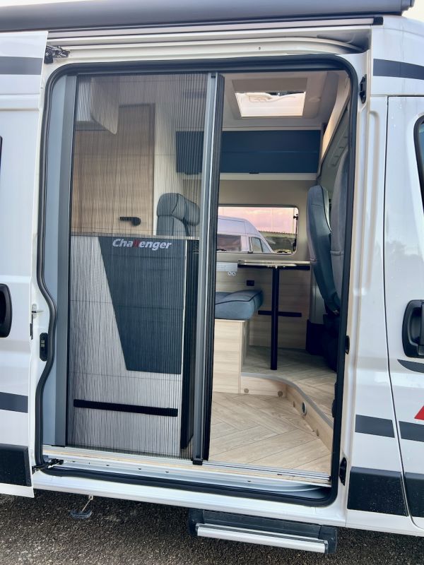 Autocaravana camper Challenger V114Max Sport Edition de la temporada 2026, con distribución de literas, comedor en rotonda, cocina y baño con ducha.