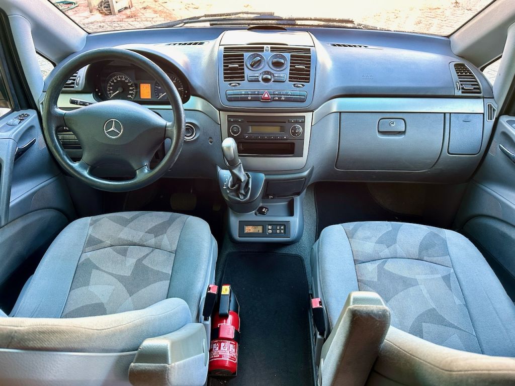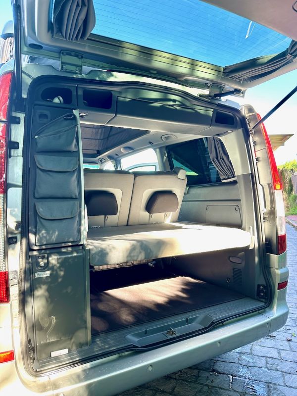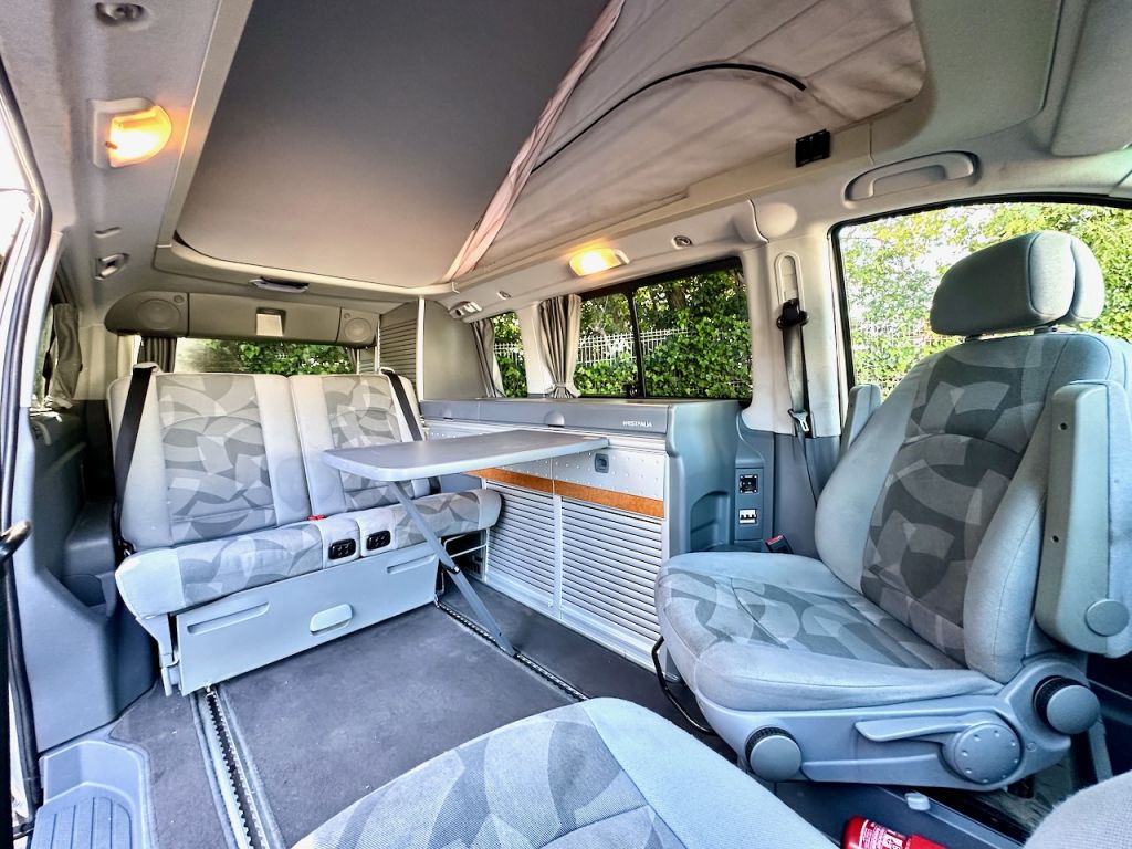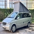 Furgoneta camperizada Mercedes Marco Polo de ocasión, con techo elevable, mueble lateral con cocina y nevera, asientos de cabina giratorios.