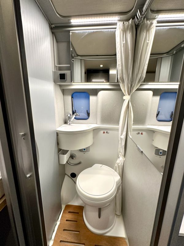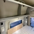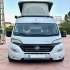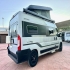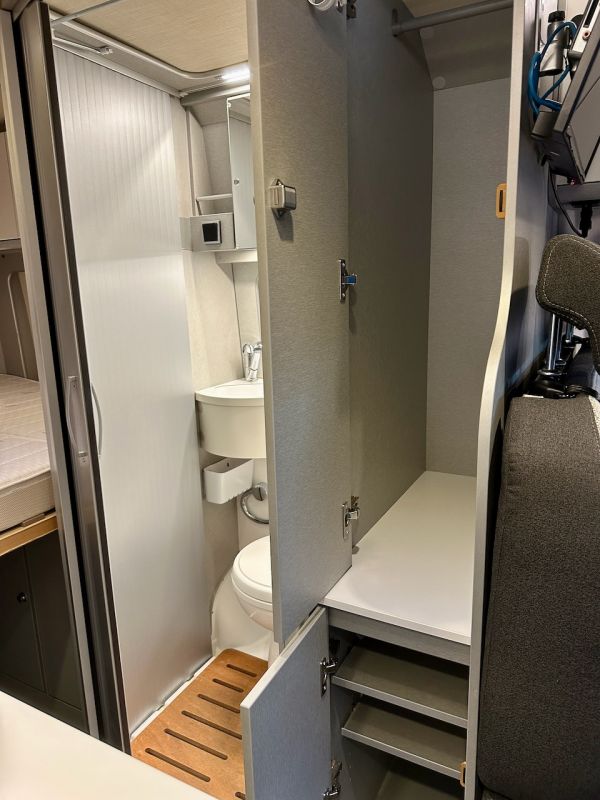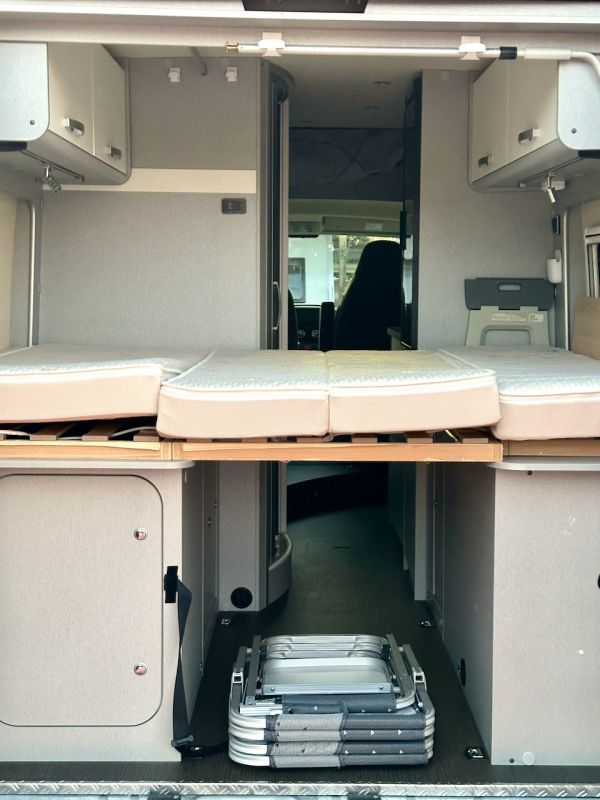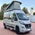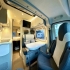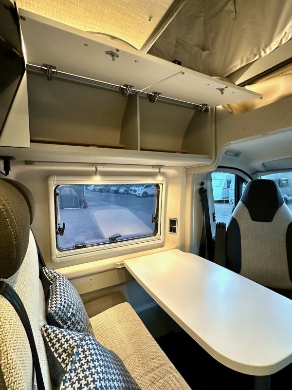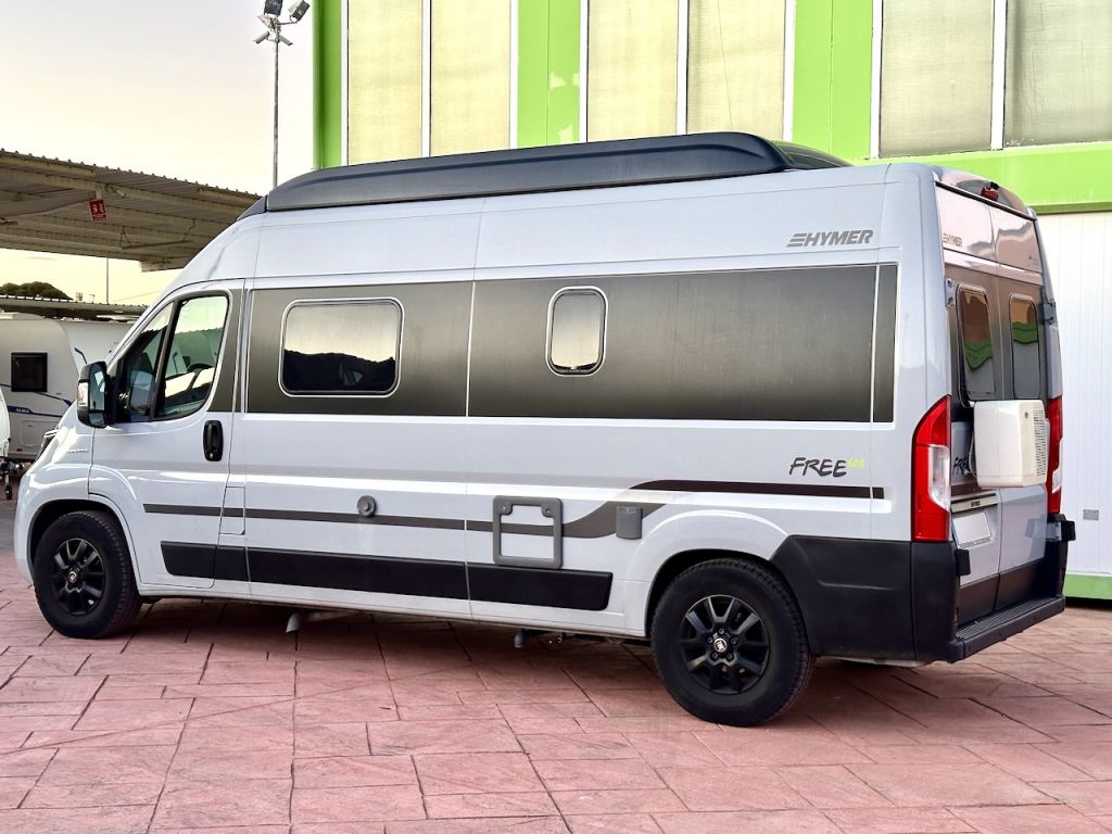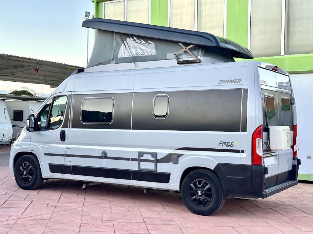 Autocaravana camper Hymer Free 600 de ocasión con distribución de cama transversal sobre garaje, techo elevable con cama para dos personas, comedor con asientos de cabina giratorios, cocina completa con nevera de 84 litros y baño con ducha.