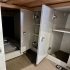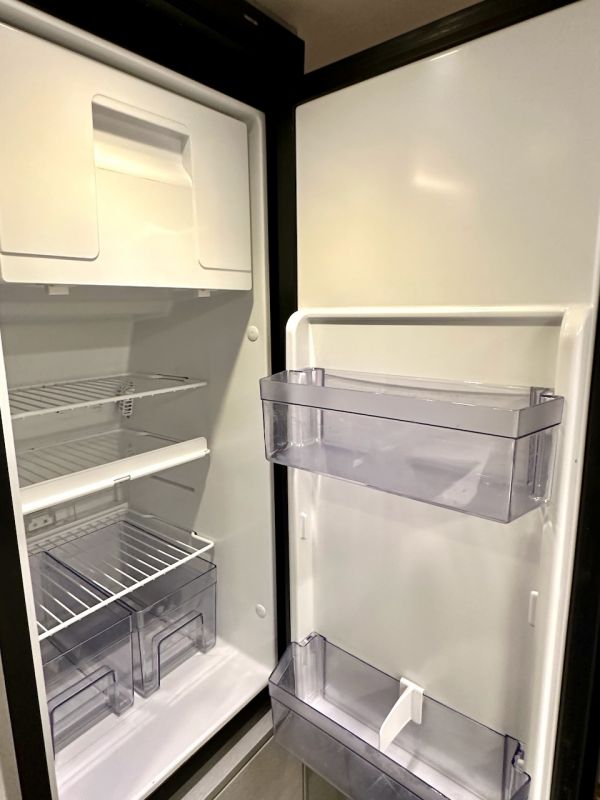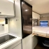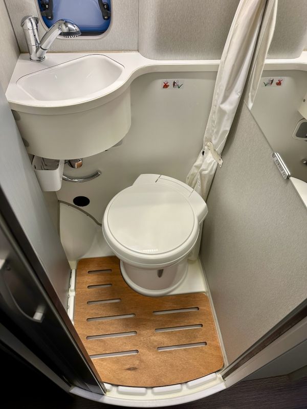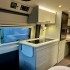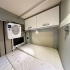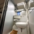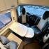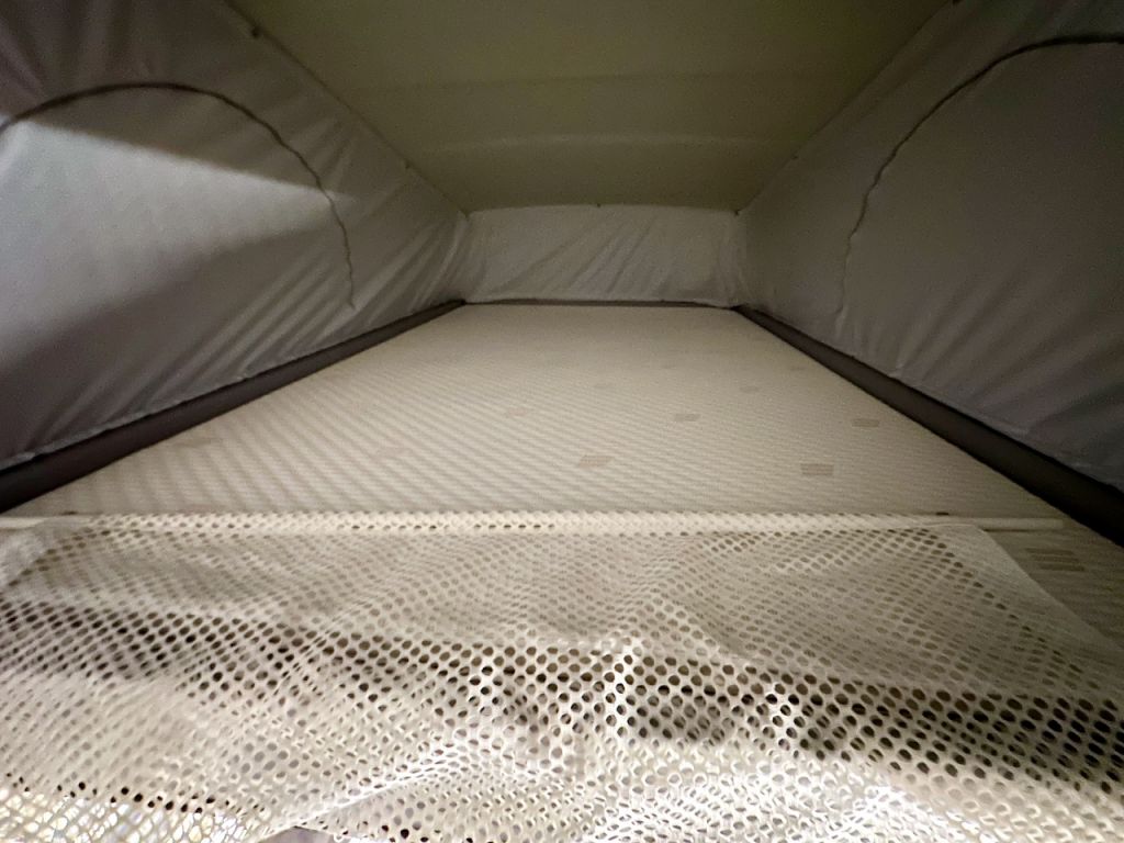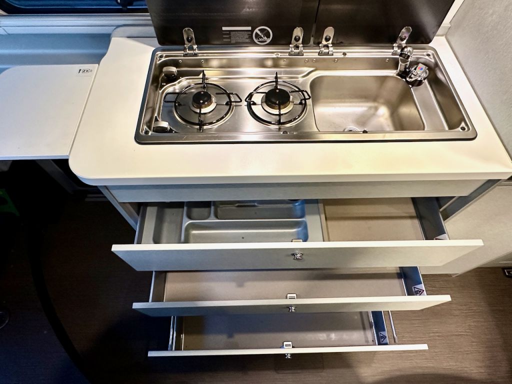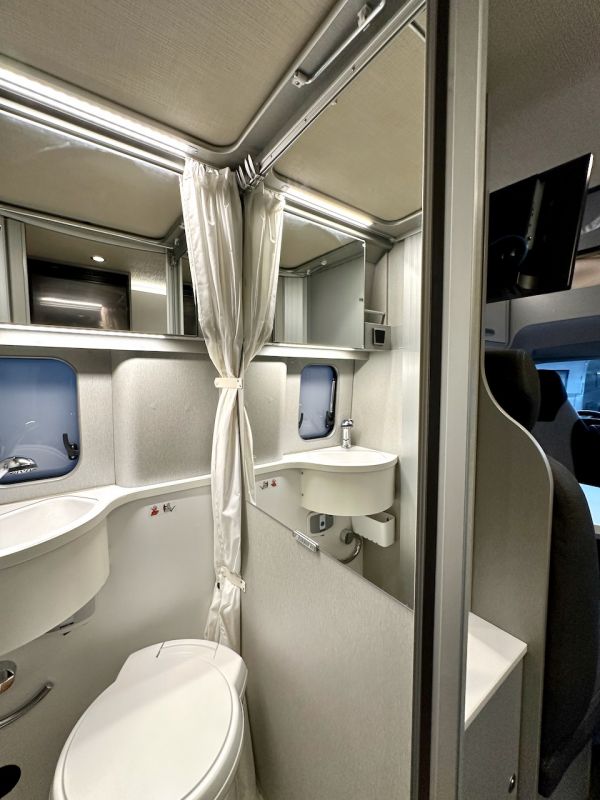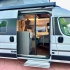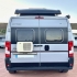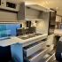 Autocaravana camper Hymer Free 600 de ocasión con distribución de cama transversal sobre garaje, techo elevable con cama para dos personas, comedor con asientos de cabina giratorios, cocina completa con nevera de 84 litros y baño con ducha.