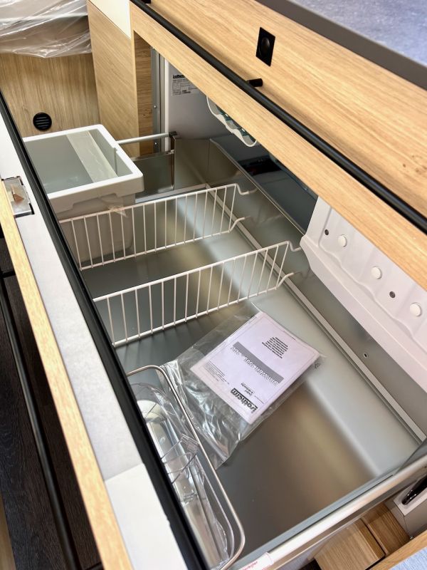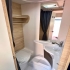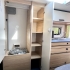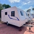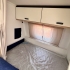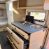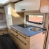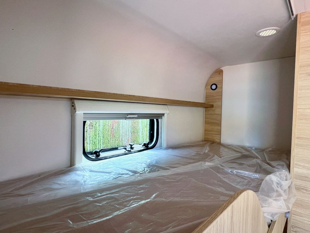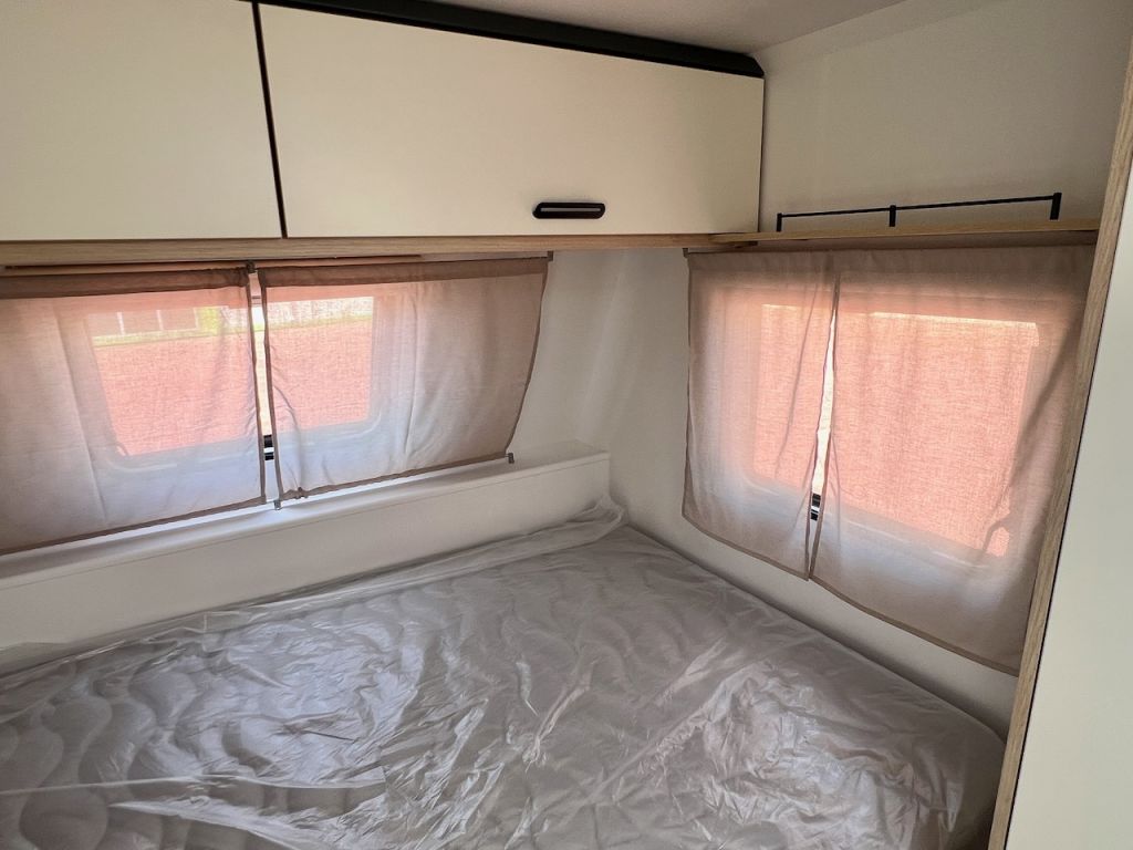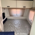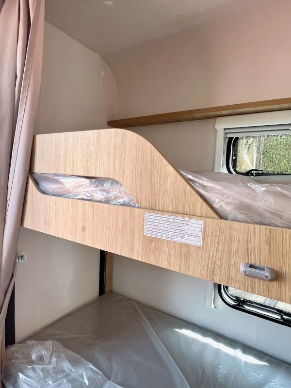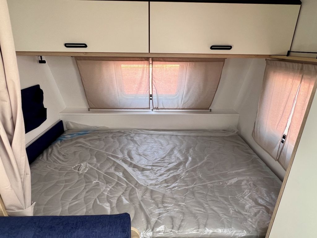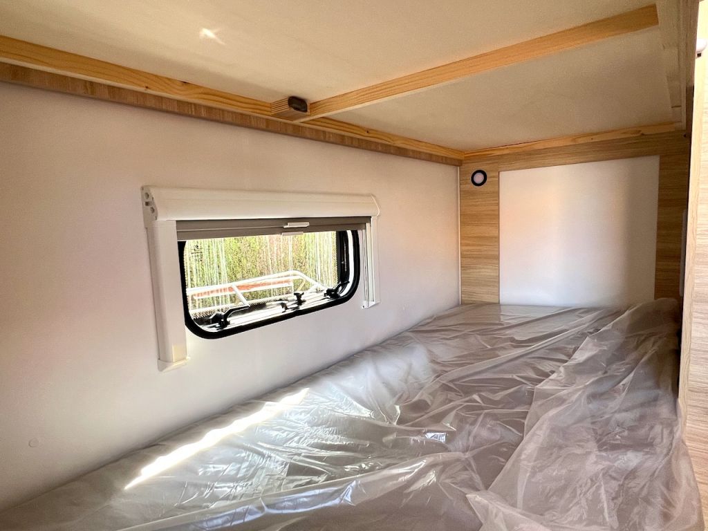 Caravana de 6 plazas, con distribución de 3 ambientes, con un gran garaje y equipada con nevera grande, armario para colgar la ropa y otro con baldas. Para dormir dispone de cama fija de dos plazas y otras dos camas fijas para niños, además del comedor transformable en una cama para dos plazas más.