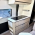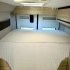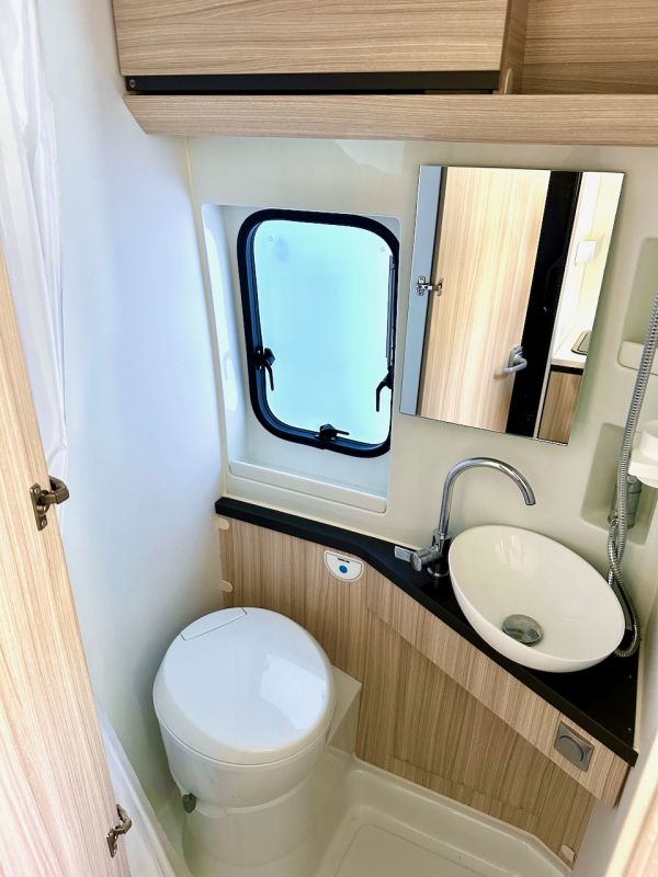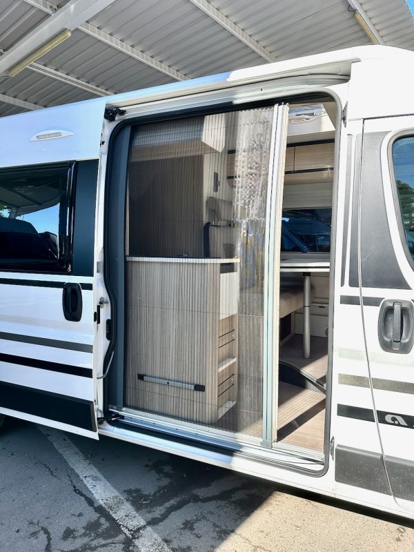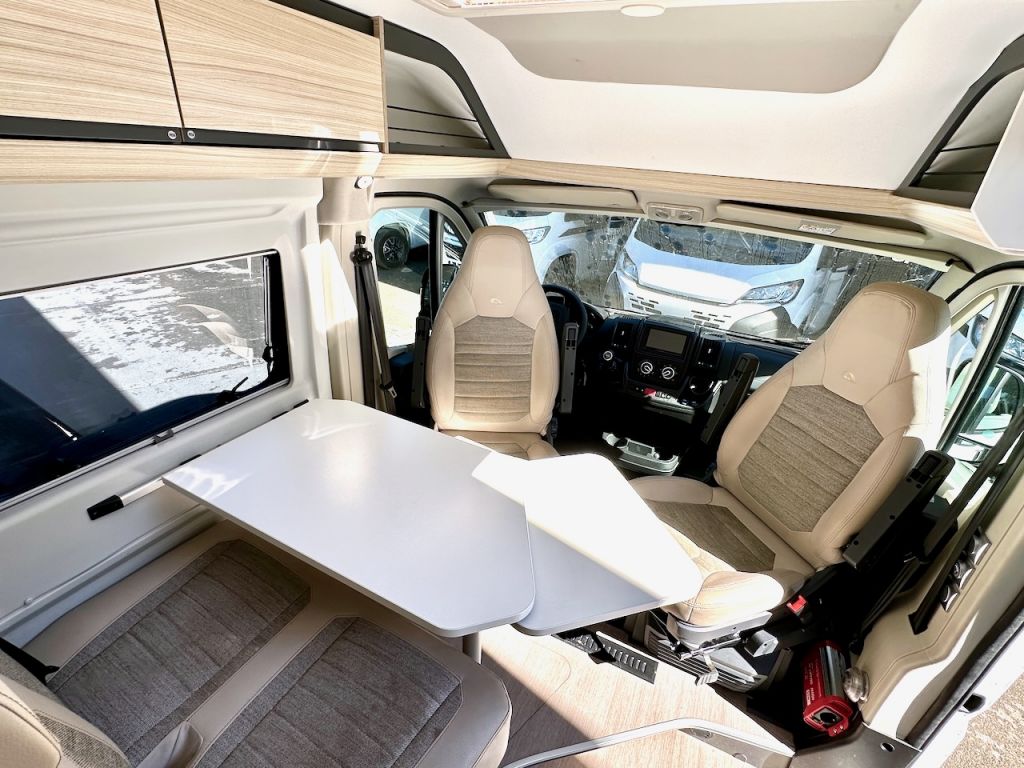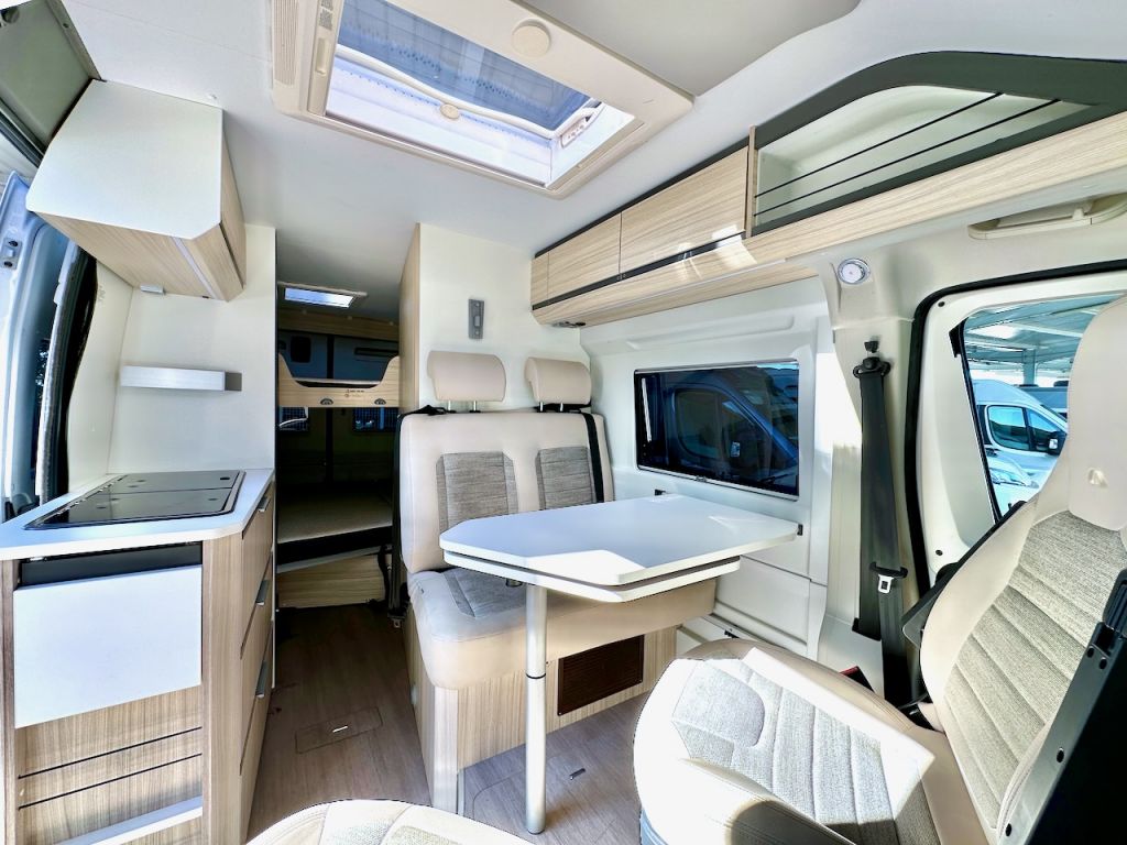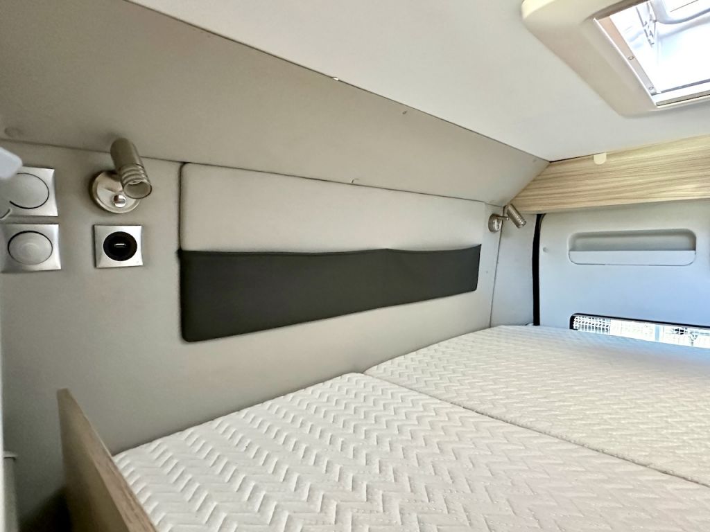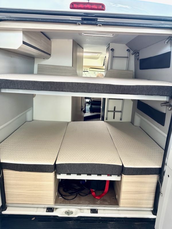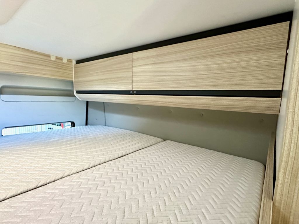 Autocaravana tipo camper Adria Twin 600 SP Family procedente de flota de alquiler con distribución de literas transversales de dos plazas cada una en la parte trasera, comedor con asientos de cabina giratorios, cocina completa y baño con ducha.