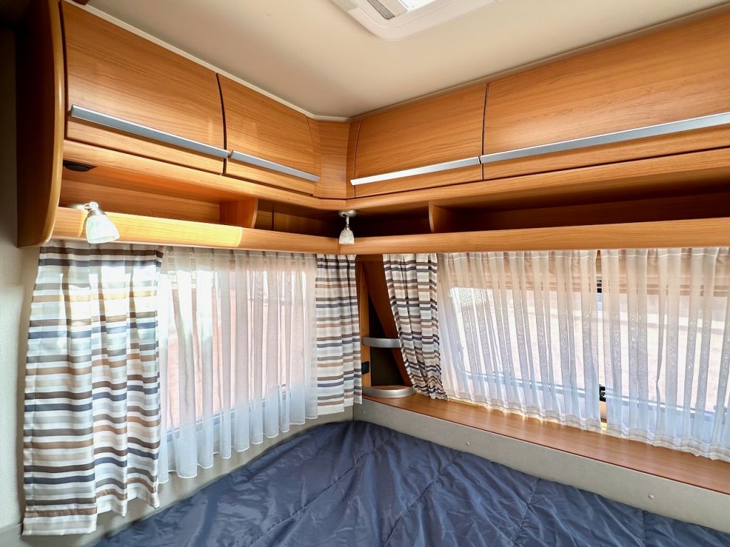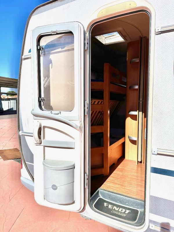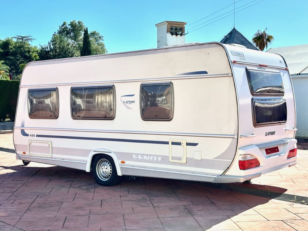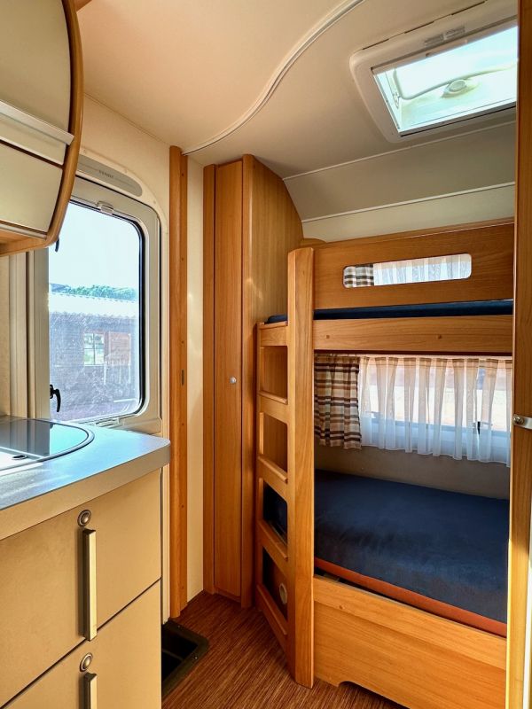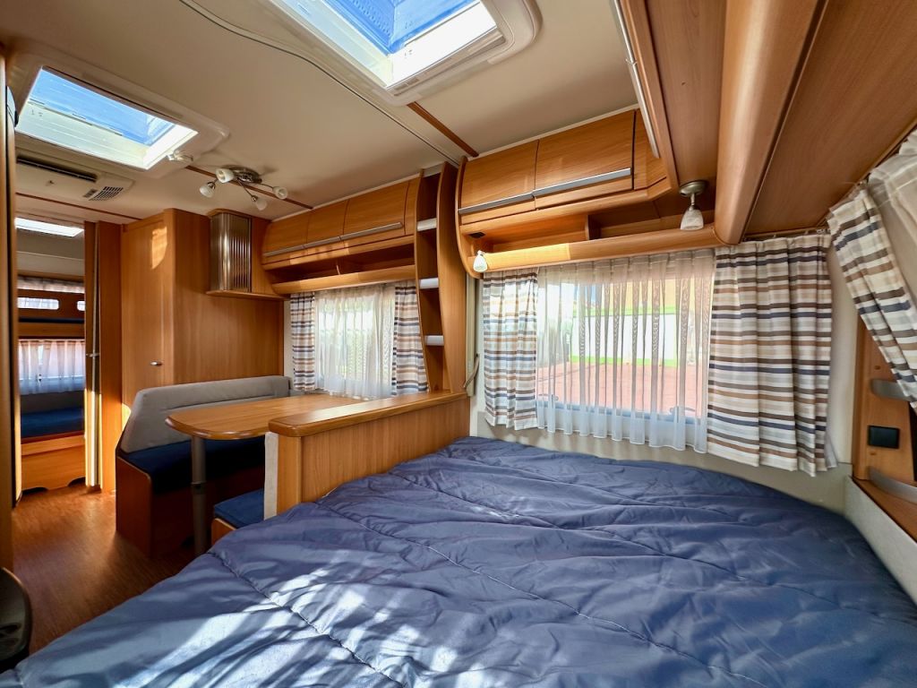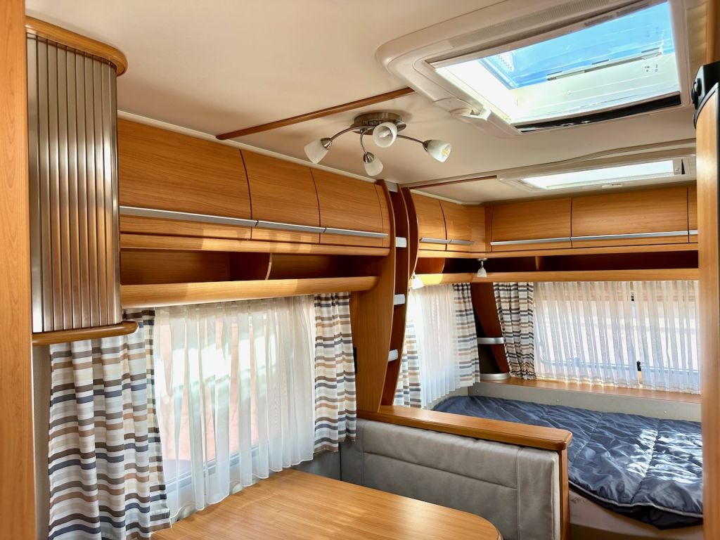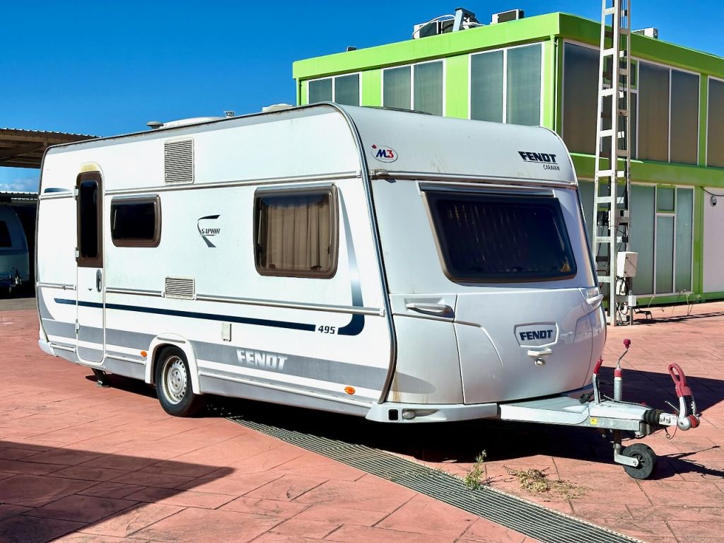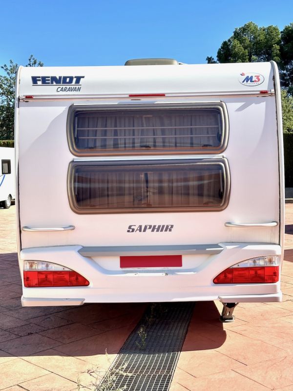 Caravana de ocasión Fendt Saphir 510 del año 2010 con distribución de tres ambientes: literas en la parte trasera, cama francesa de dos plazas en la parte delantera, comedor enfrentado, cocina completa con nevera de 160 litros, WC con ducha.