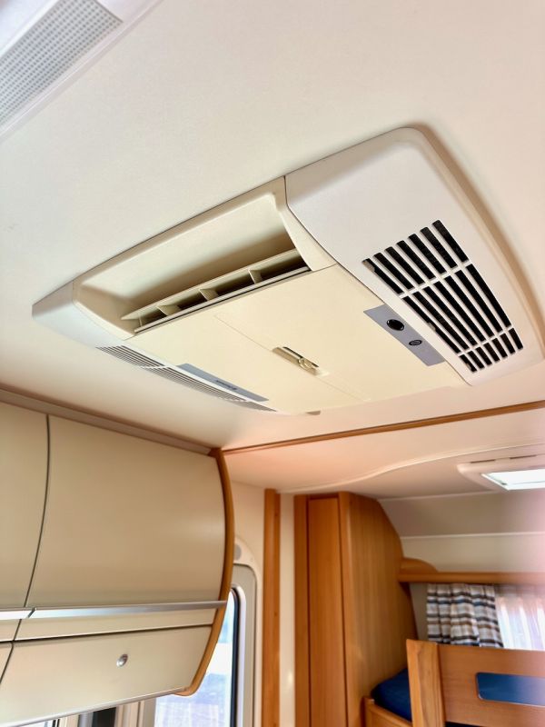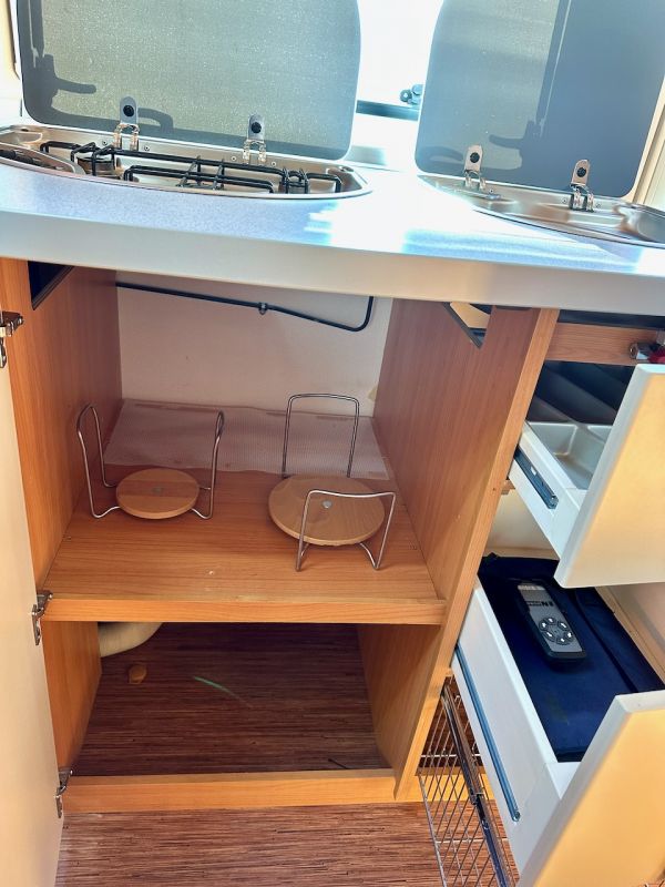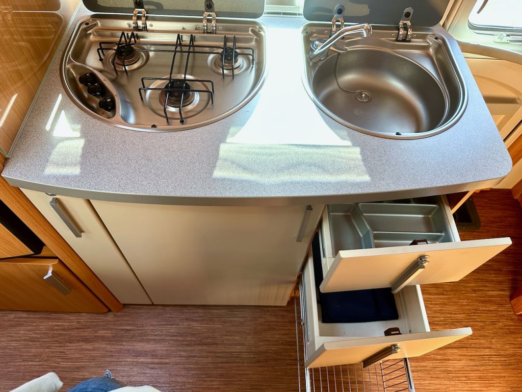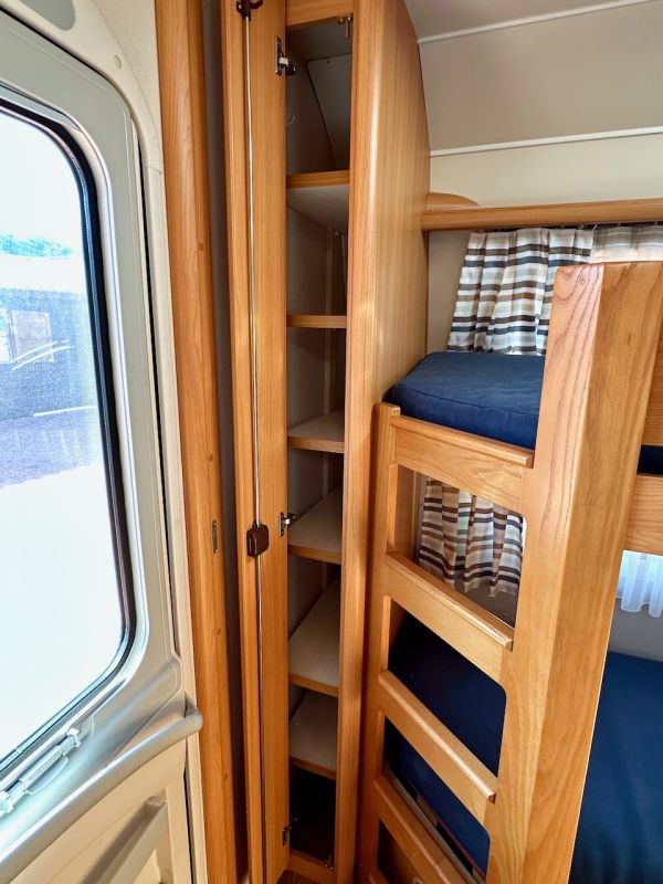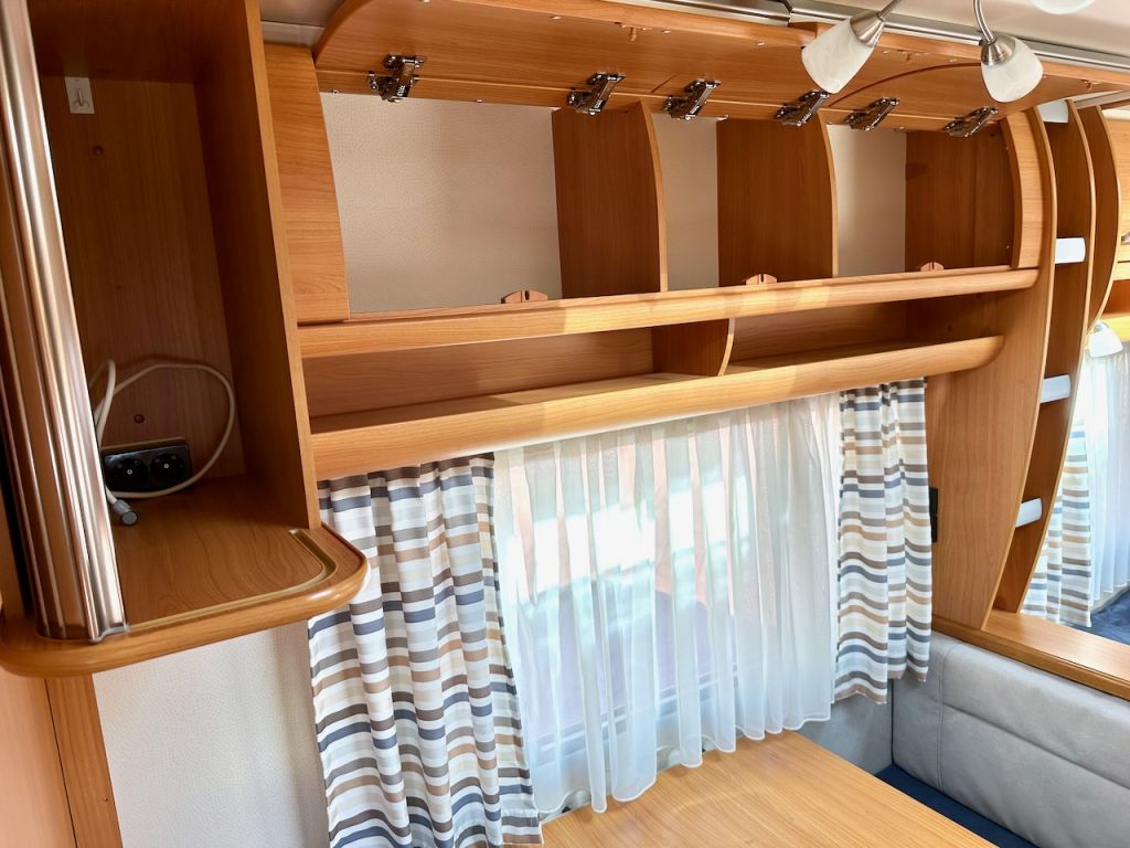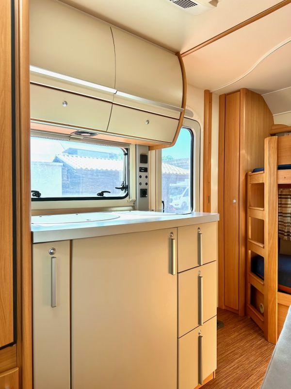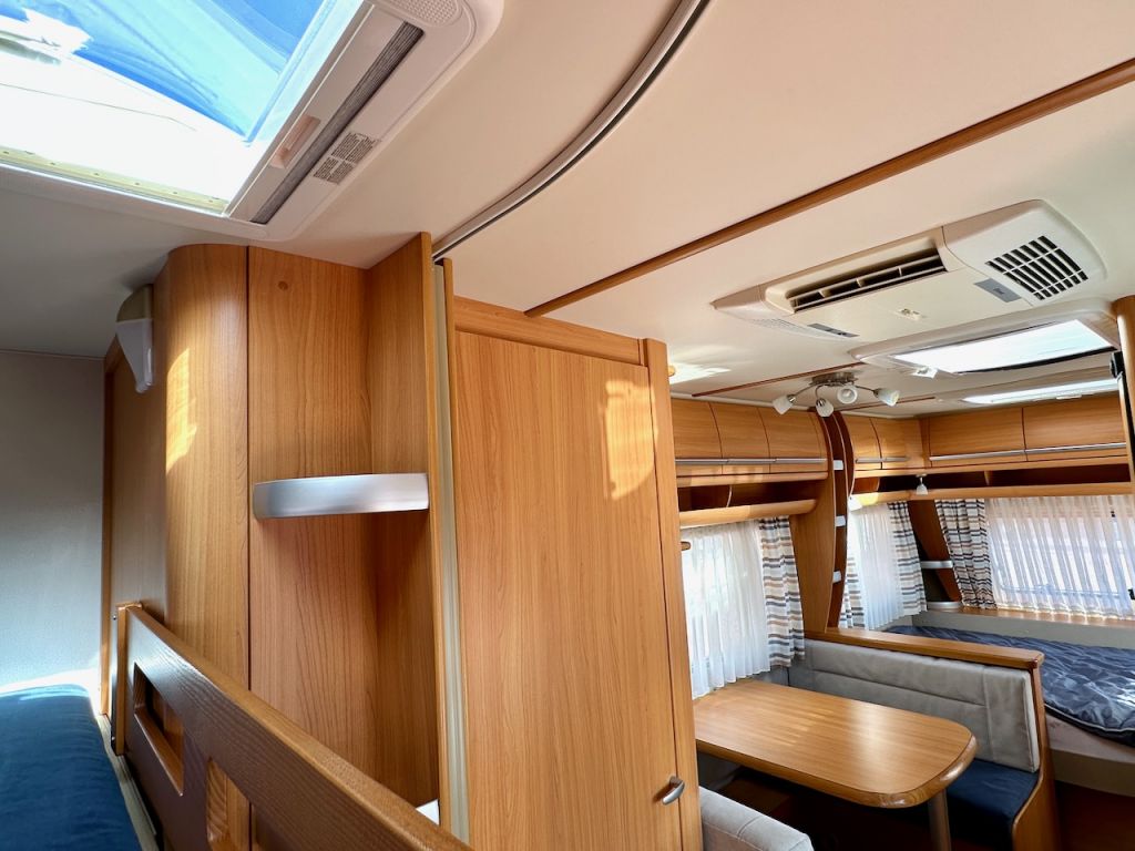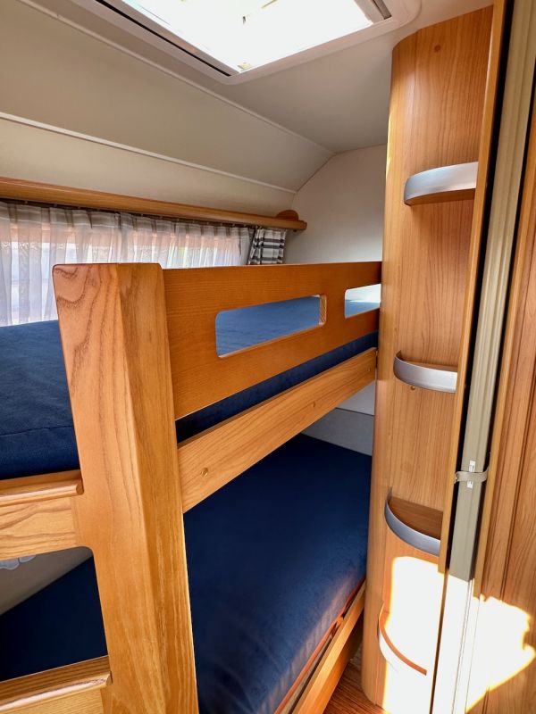 Caravana de ocasión Fendt Saphir 510 del año 2010 con distribución de tres ambientes: literas en la parte trasera, cama francesa de dos plazas en la parte delantera, comedor enfrentado, cocina completa con nevera de 160 litros, WC con ducha.