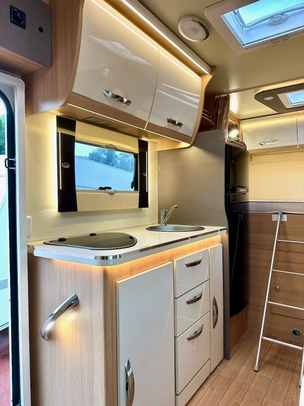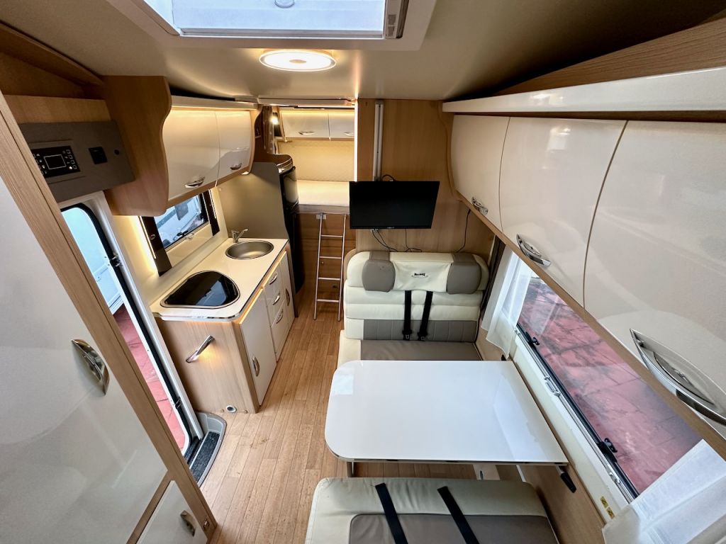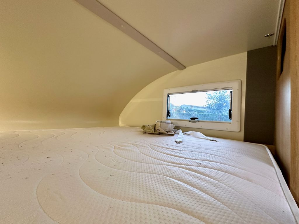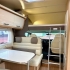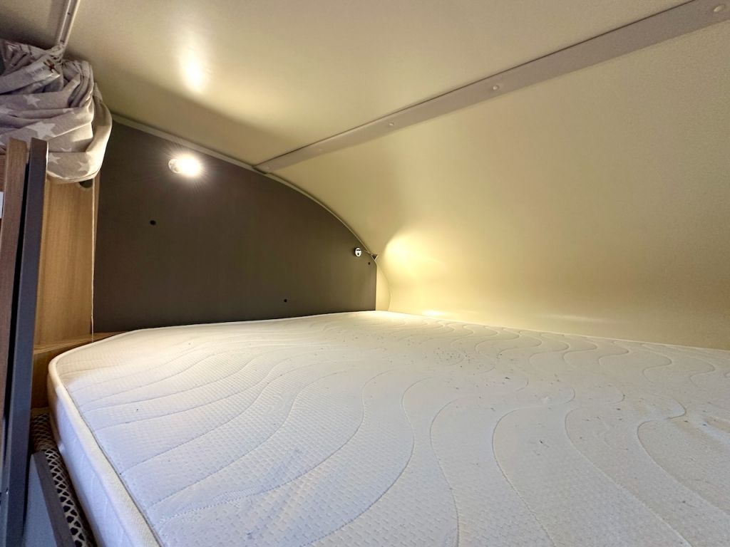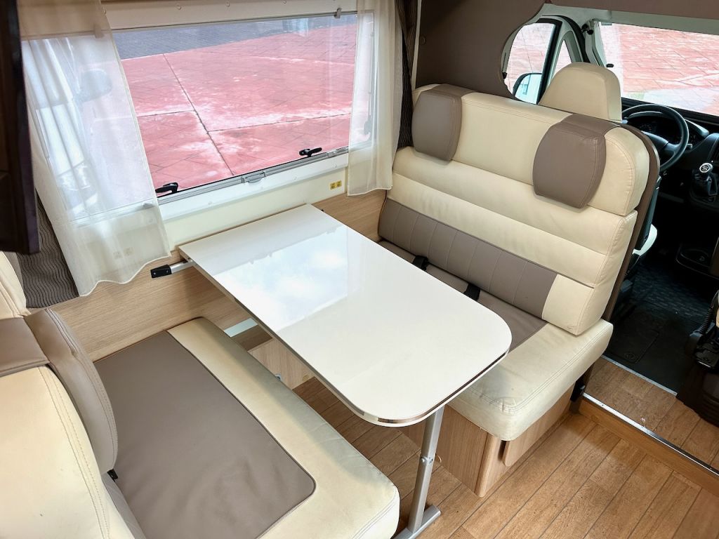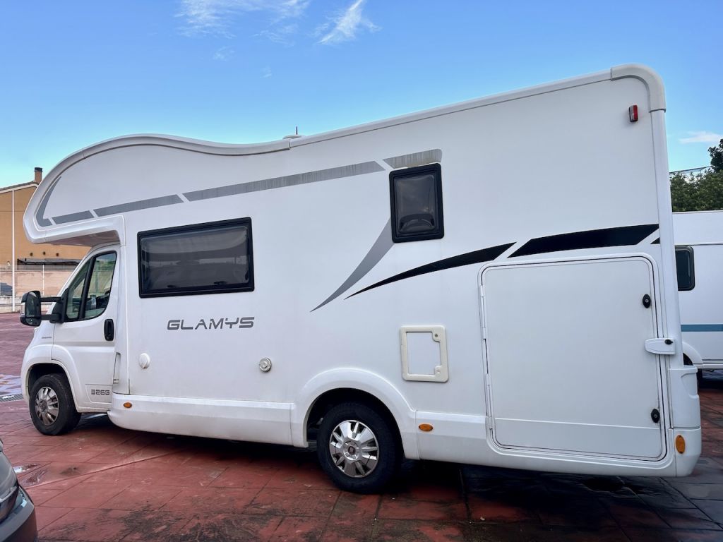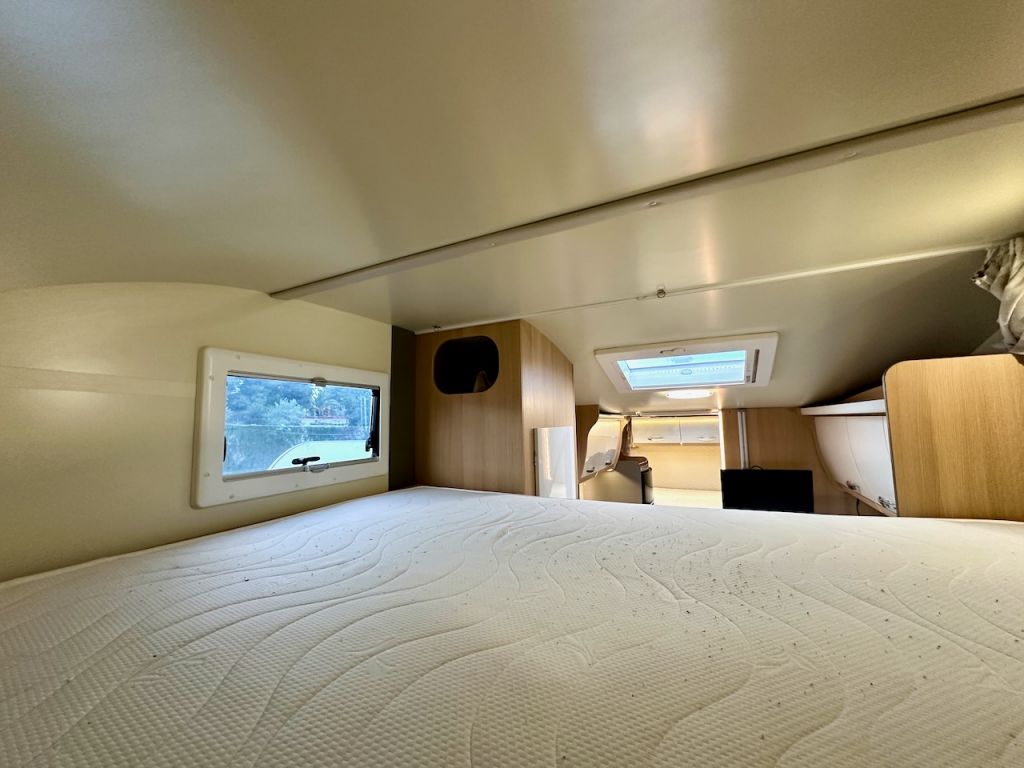 Autocaravana capuchina de ocasión McLouis Glamys 326. Distribución de cama transversal en el dormitorio (regulable en altura para modular el espacio del garaje), cama de matrimonio en la capuchina, comedor enfrentado convertible en cama, cocina completa y baño con ducha.