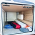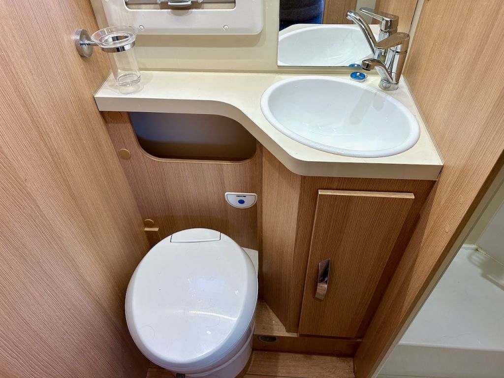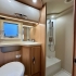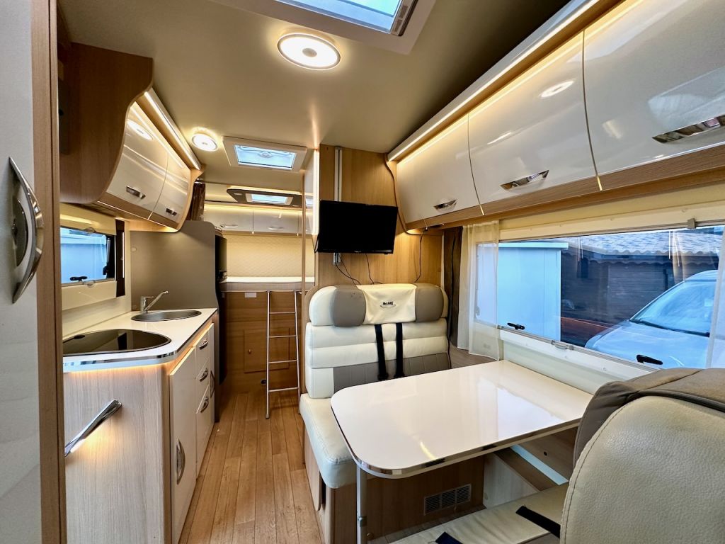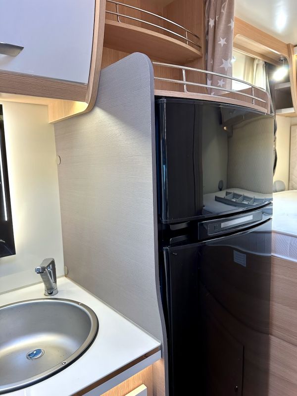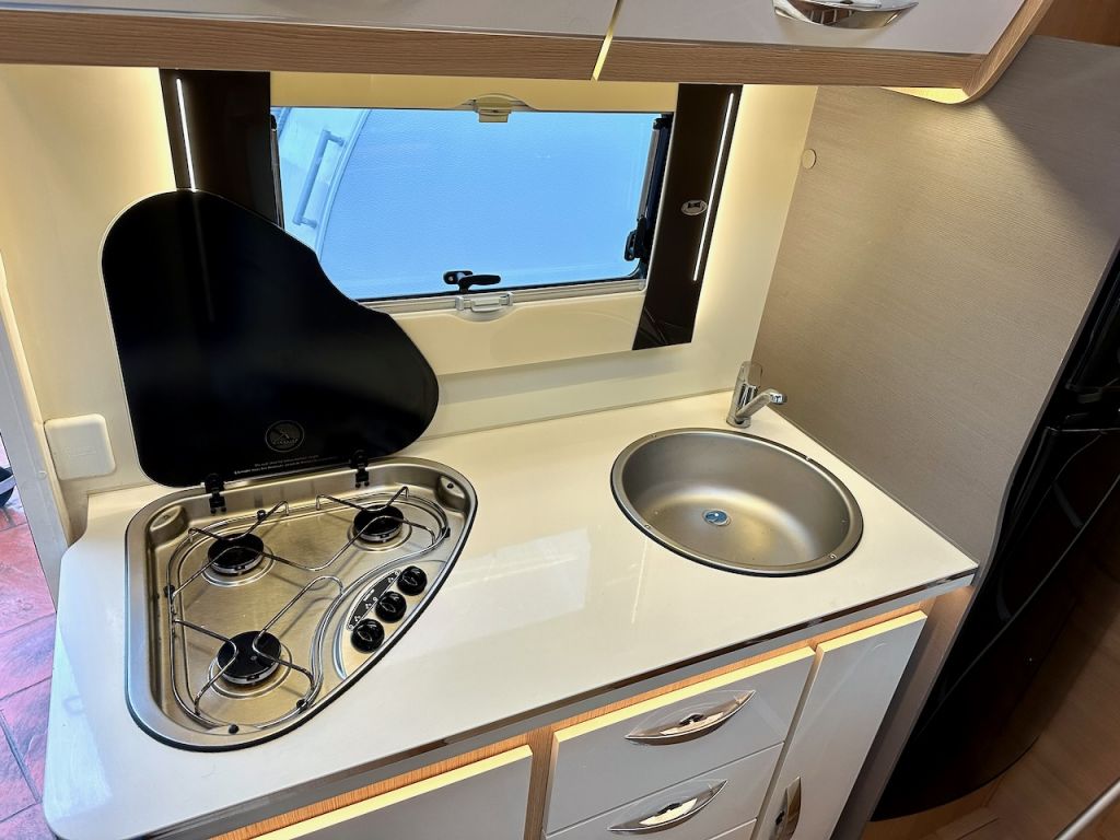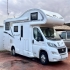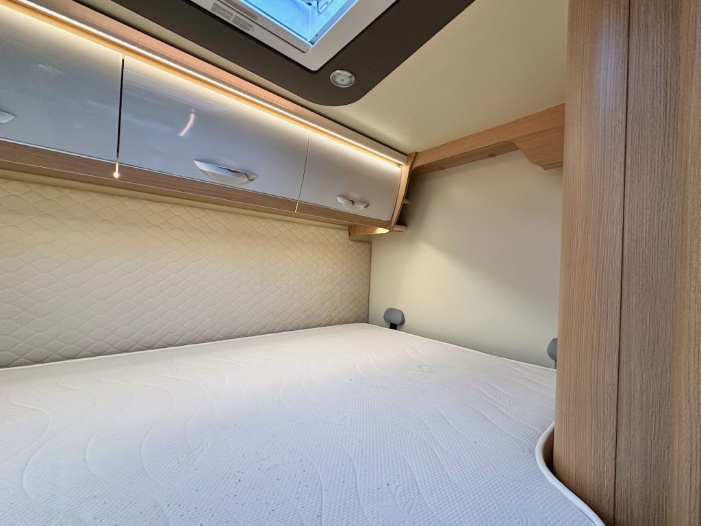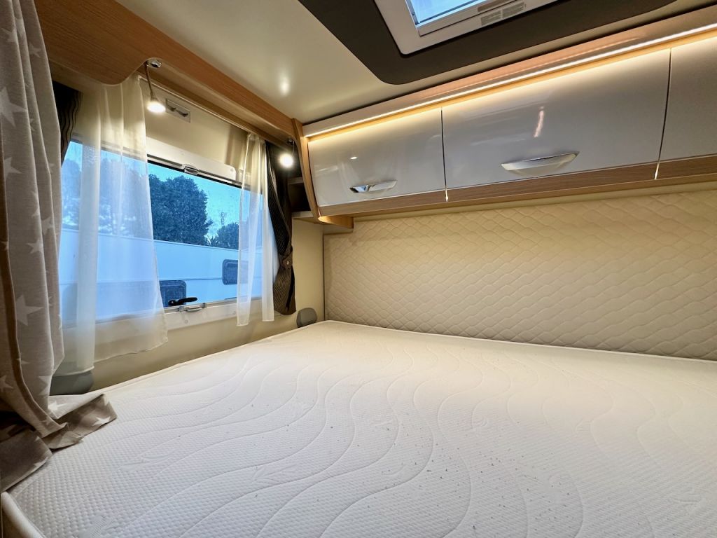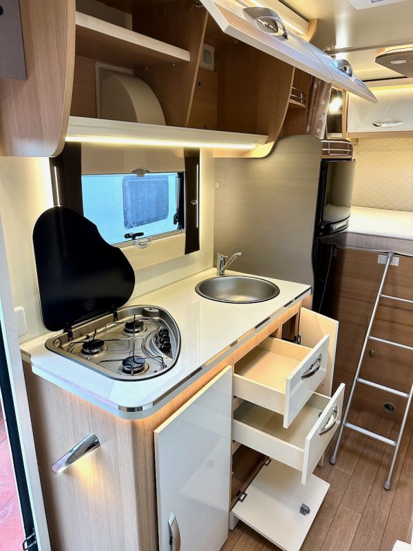 Autocaravana capuchina de ocasión McLouis Glamys 326. Distribución de cama transversal en el dormitorio (regulable en altura para modular el espacio del garaje), cama de matrimonio en la capuchina, comedor enfrentado convertible en cama, cocina completa y baño con ducha.